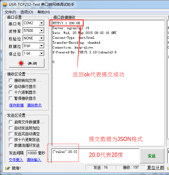 10:将WiFi模块的串口连接到电脑串口,使用串口调试助手发送提交数据。使用串口发送提交的数据。提交数据按照JSON格式提交。