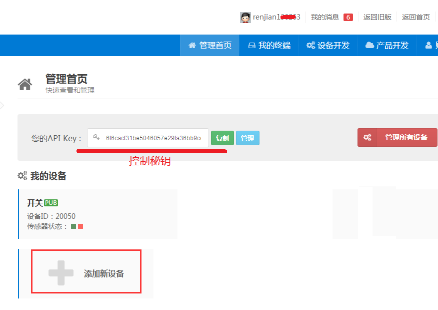 登陆自己账号后,系统自动生成API KEY秘钥,用户WiFi模块通信时提交的验证。点击添加新设备。