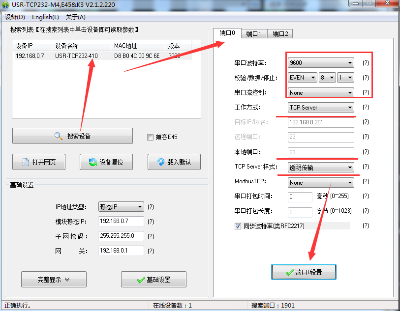 1:将串口服务器网口直连电脑网口或者连接路由器网口。使用设置软件设置参数:搜索设备,设置串口服务器的IP地址与局域网网段一致,设置串口服务器的波特率为9600,校验数据位停止位:EVEN 8 1。这个参数要和PLC的参数一致。打包时间和长度都设置为0.然后端口0设置。(注:搜索到的版本要在3006及3006以上才支持)