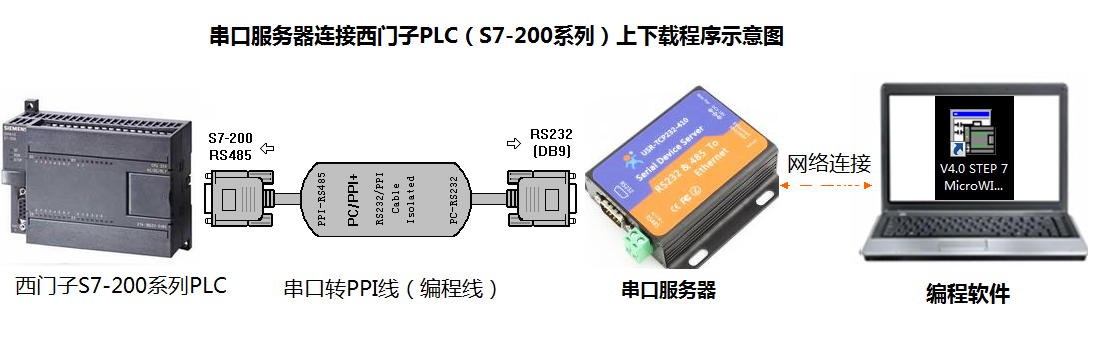 硬件连接:S7-200 PLC连接PPI编程线缆,PPI编程线缆的RS232端连接串口服务器的RS232口,串口服务器网口连接电脑网口或者路由器网口。
