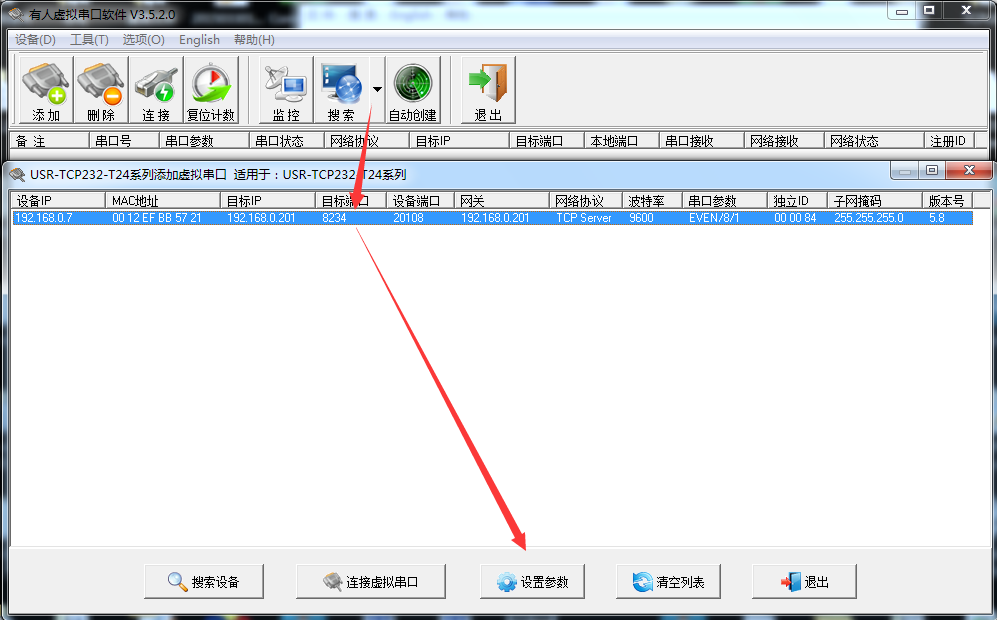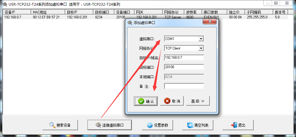 使用虚拟串口软件搜索串口服务器,选择USR-TCP232-T24。