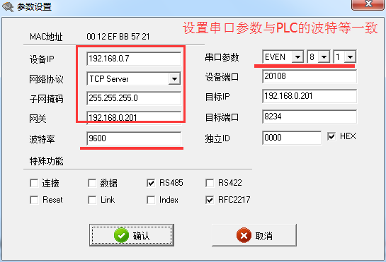 2:设置串口服务器的IP地址与局域网网段一致,设置串口服务器的波特率为9600,校验数据位停止位:EVEN 8 1。这个参数要和PLC的参数一致。然后点击确认。