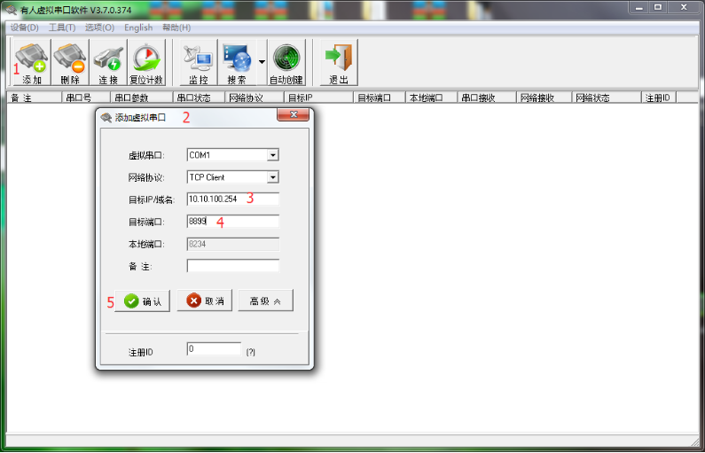 i)已添加COM口连接到模块后,虚拟串口软件上的网络状态会显示已连接。如网络状态显示连接失败,请将604模块恢复默认设置并重复上述步骤。