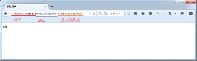 1.浏览器模拟GET方法提交数据到服务器。通过浏览器以GET的方法向服务器enjian-usr.6655.la提交数据,分别变量name和age传入参数,提交成功返回OK。 renjian-usr.6655.la/get1/alluser.php?name=aaa&age=10