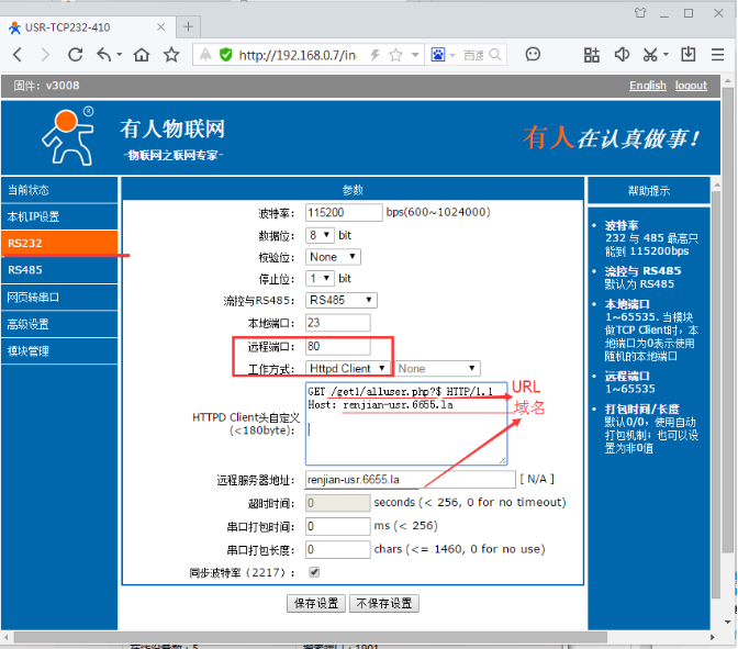 将串口服务器网口连接可以上网的交换机或者路由器,然后登陆网页设置参数,测试以RS232口为例,将工作方式设置为Httpd Client。远程端口80(服务器的网页端口)远程服务器地址renjian-usr.6655.la