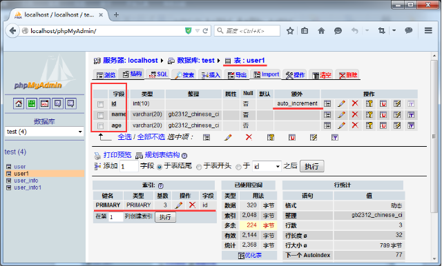 (2)mysql数据库搭建:在数据库test内新建一个数据表user1