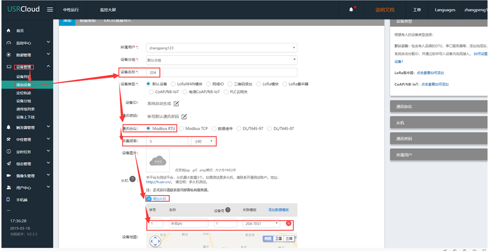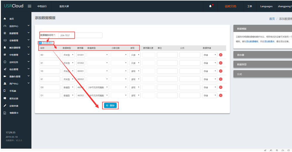 2、登录云平台,添加设备和数据模板