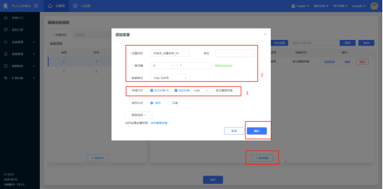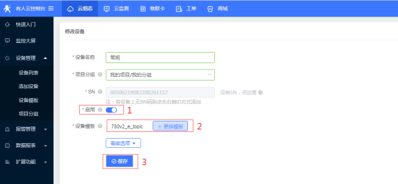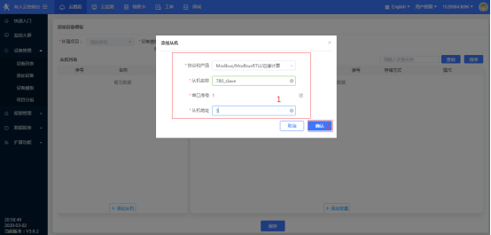 2、登录有人云组态平台,在设备管理界面添加设备,设备IMEI和SN编号唯一,可以在设备背面标签查看。点击下一步,选择相应的模板,点击保存;完善从机信息和从机数据点(要采集的PLC或终端设备的寄存器地址)。
