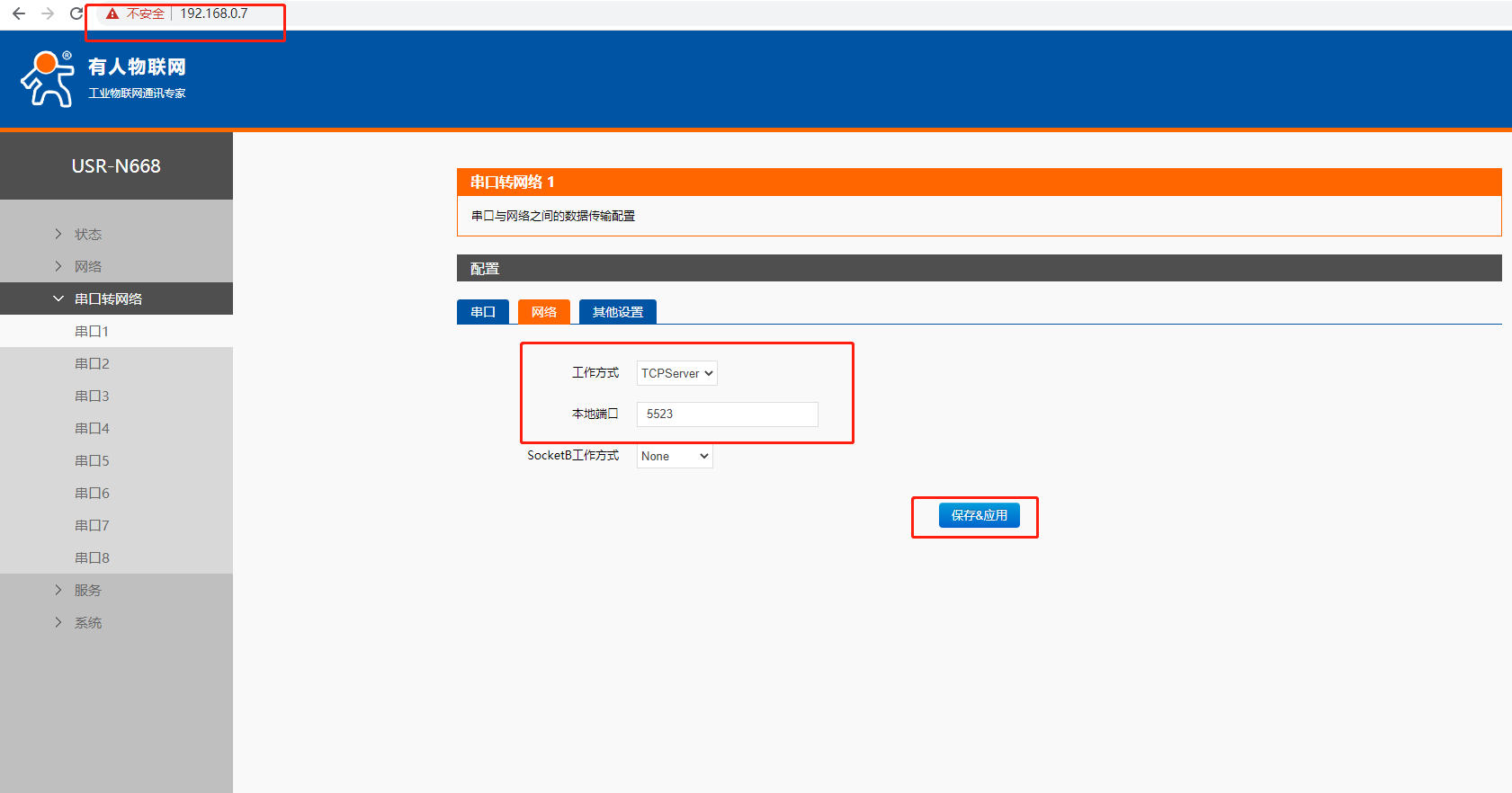 4、打开浏览器,浏览器输入IP:192.168.0.7进入N668的内置网页,用户名密码默认为admin,模块工作方式设为TCP SERVER,本地端口5523,点击保存参数。重启设备完成设置。