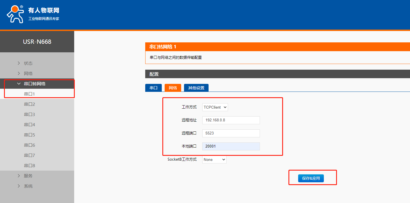 5、通过内置网页进入另一台N668的配置,点为了防止IP冲突,将此设备IP修改为192.168.0.8,模块工作方式设为TCP Client,本地端口0,远程端口5523,点击保存参数。
