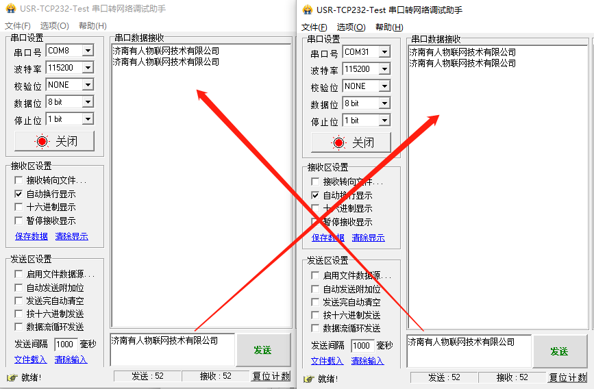 7、打开两个串口调试助手,分别选择正确的串口以及串口参数,实现两个串口直接数据互发。