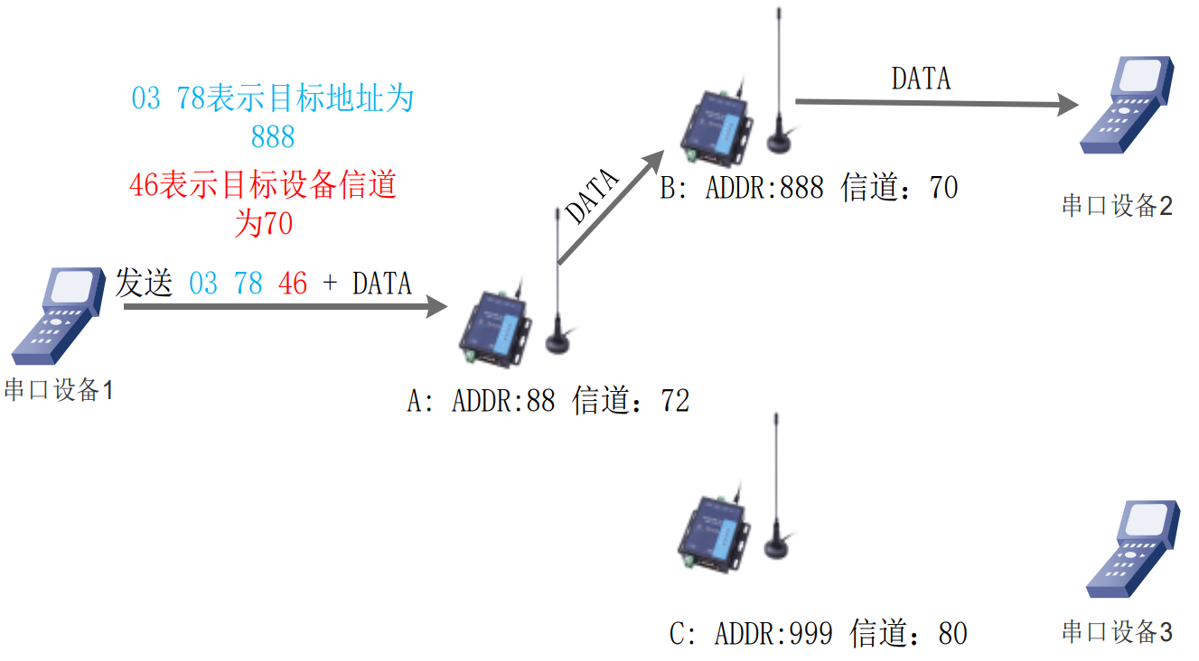 LoRa 数传终端 A(目标地址(ADDR):88,信道(CH):72)想向另一台 LoRa 数传终端 B(目标地址 (ADDR):888,信道(CH):70)发送数据 DATA(123456),则只需要按照 16 进制发送(03 78 46 31 32 33 34 35 36),则 LoRa 数传终端 B 接收到数据(31 32 33 34 35 36)。
