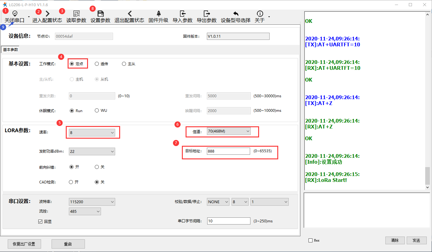 设备B:定点模式,速率8,信道70,目标地址888。