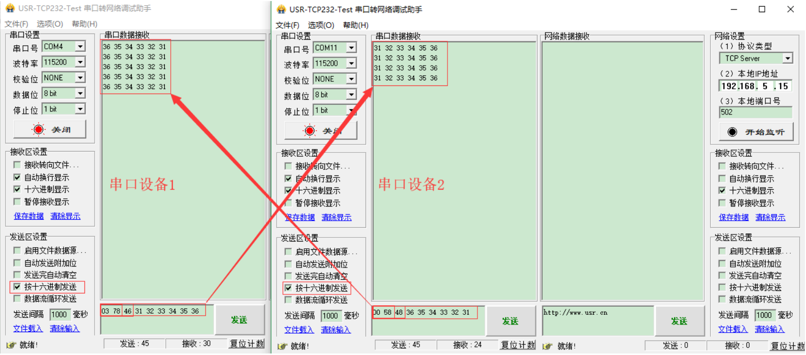 启动两个USR-TCP232-Test(模拟串口设备1,2)分别连接LoRa数传终端A、B的串口,使用串口设备1发送数据串口设备2可接收数据(反之亦然)。