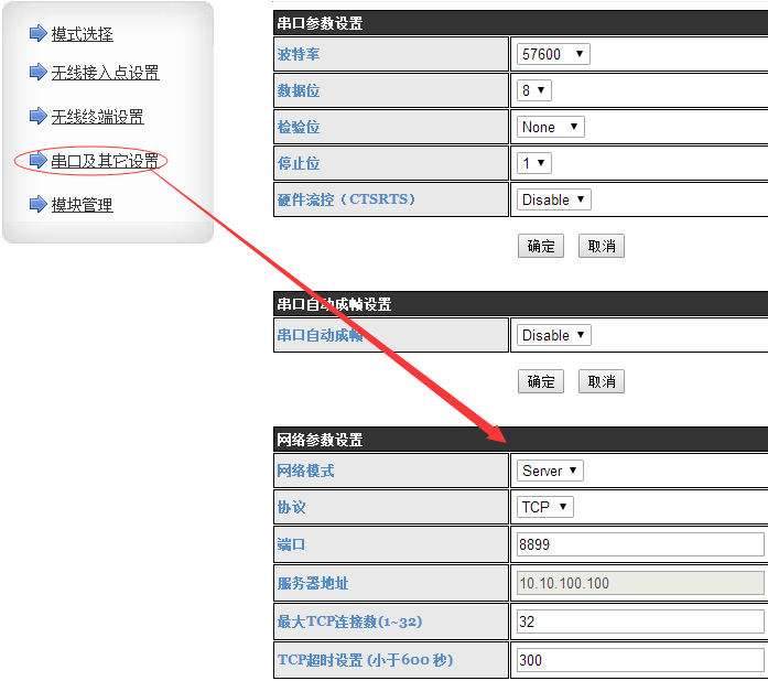 该实验都是在模块默认情况下。AP模式TCP server。