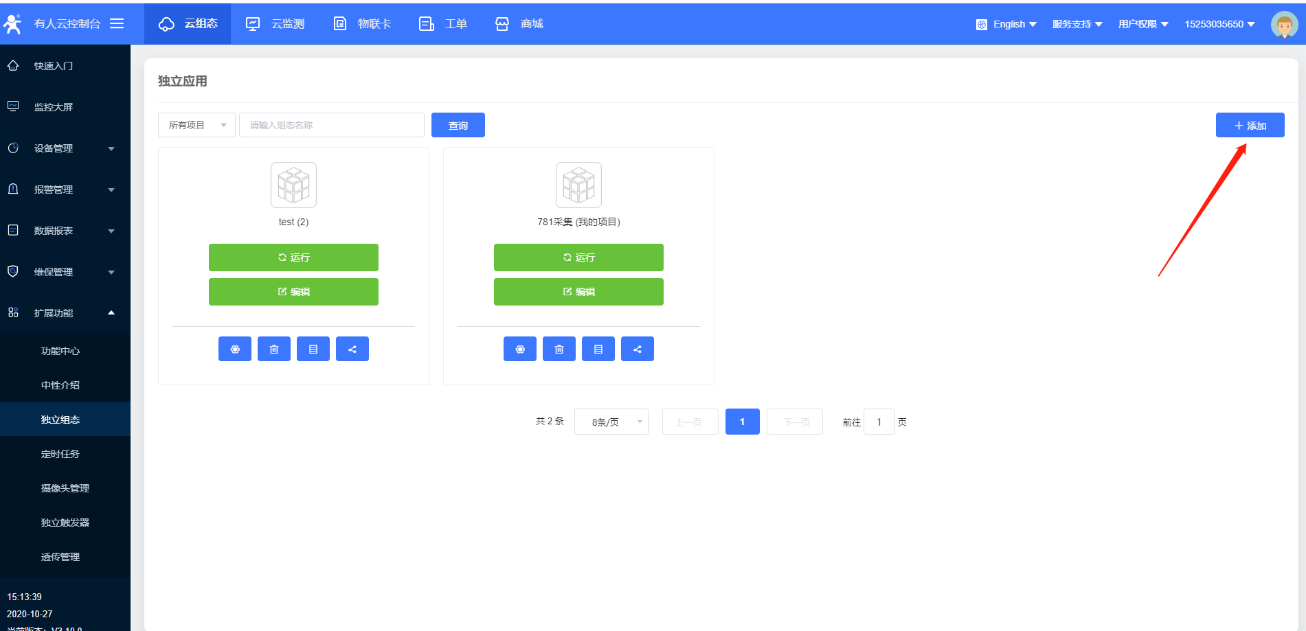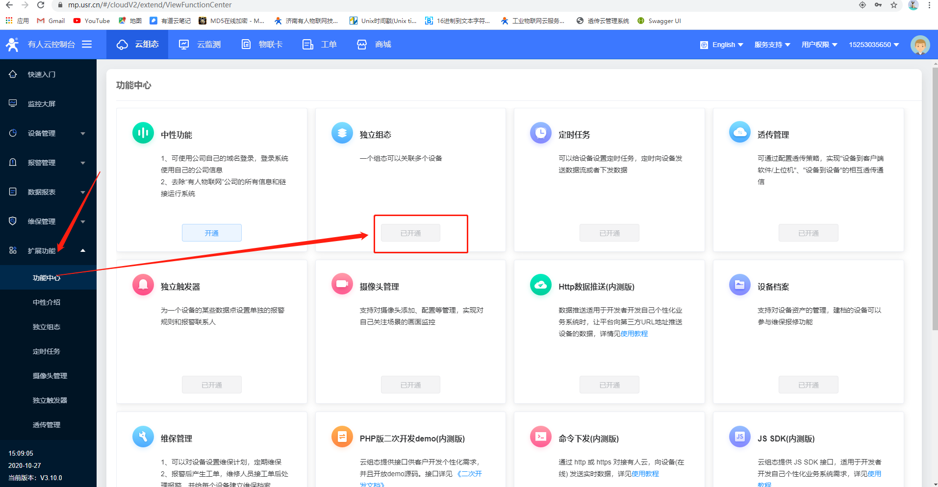 1.登录有人云,扩展功能》功能中心》开通独立组态