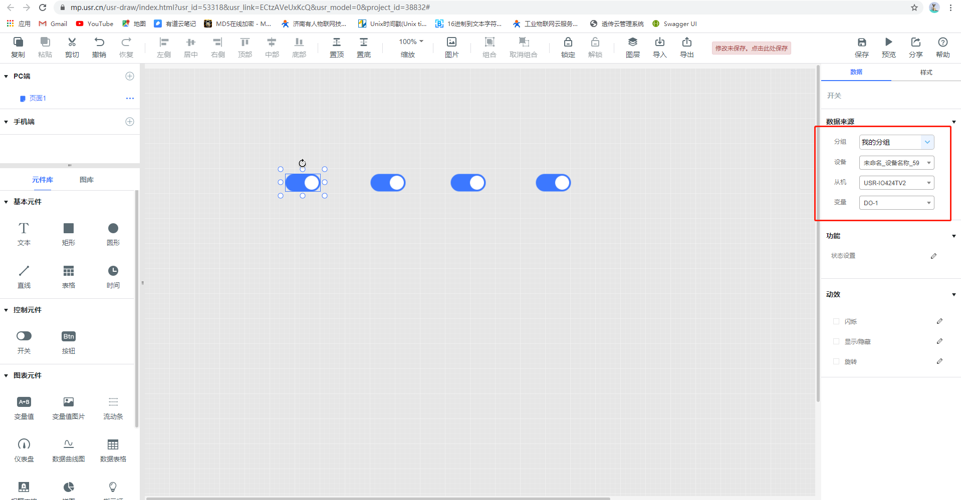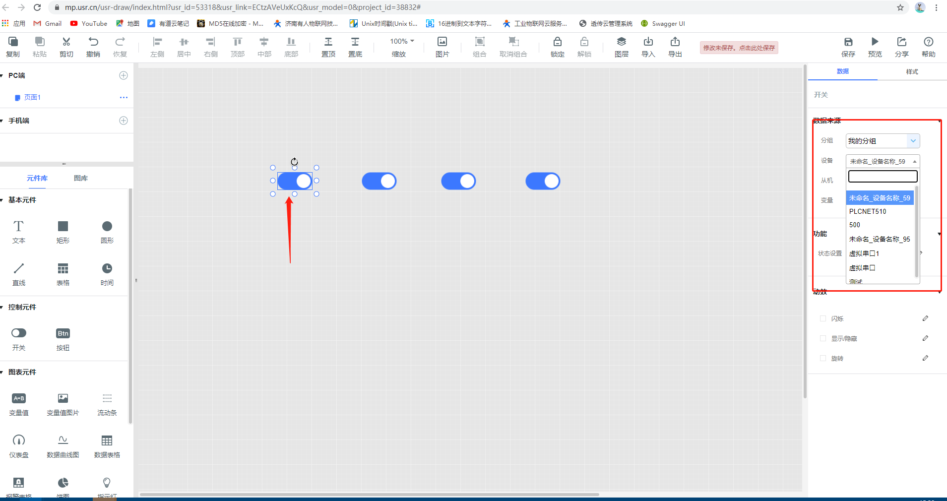 4.添加控件,一个组态画面添加多个控件,可以同时关联多个设备下的多个数据点,注意:独立组态不支持监控大屏显示