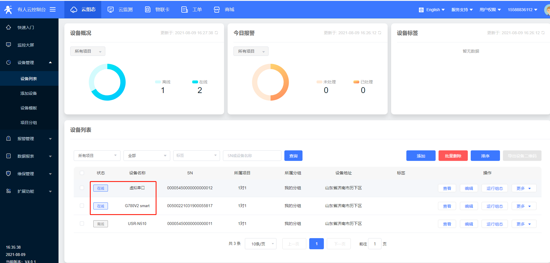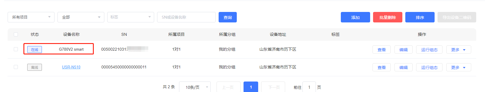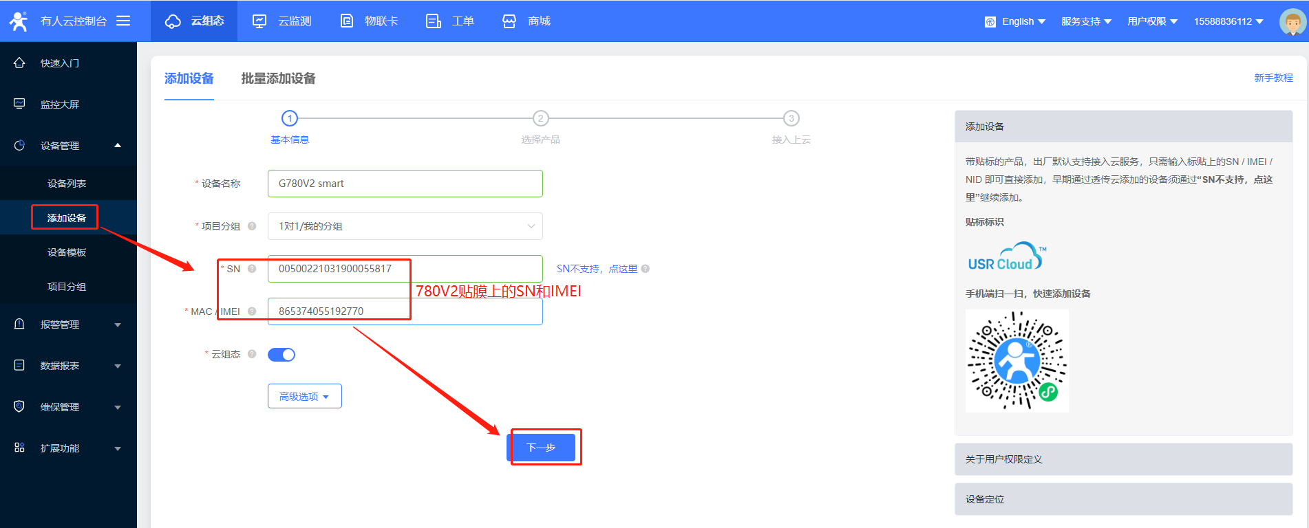 2>添加G780V2,以SN和IMEI添加,选择数据透传模板