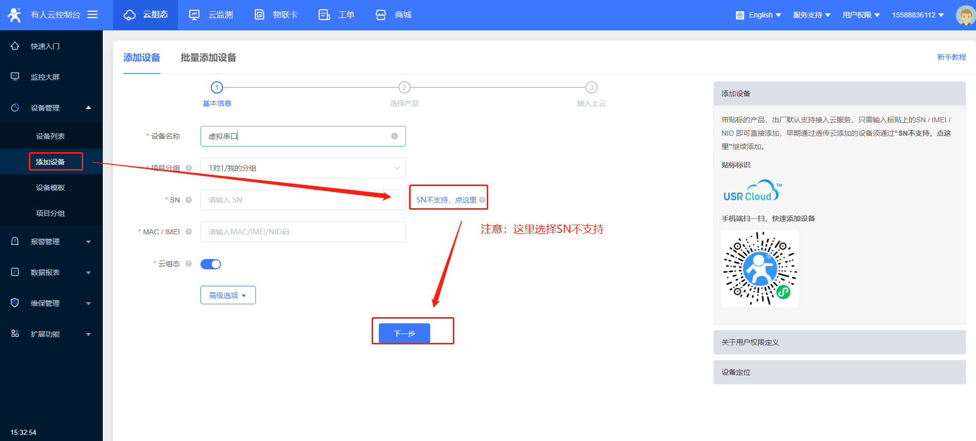 注意:这个设备不支持SN添加