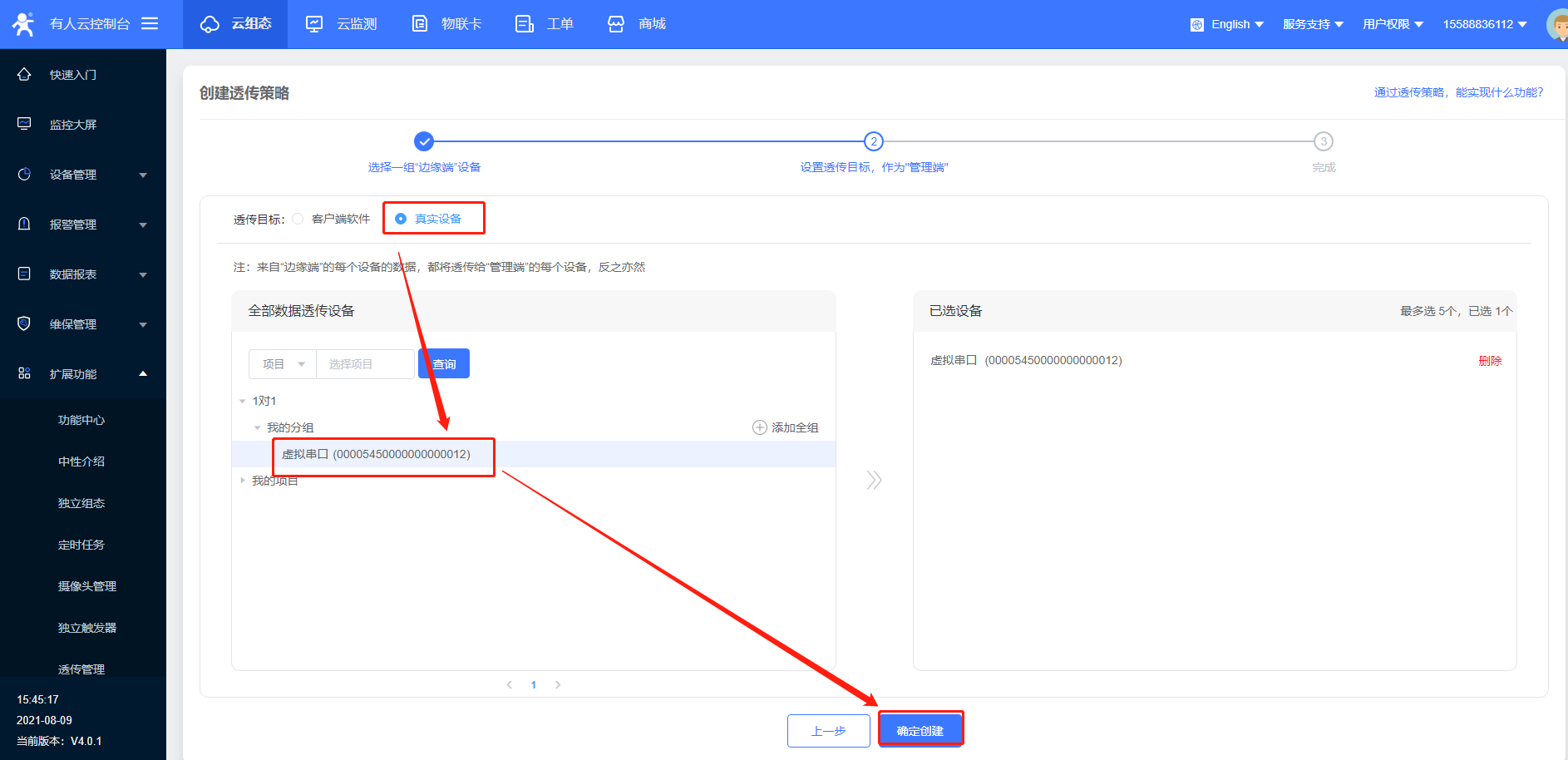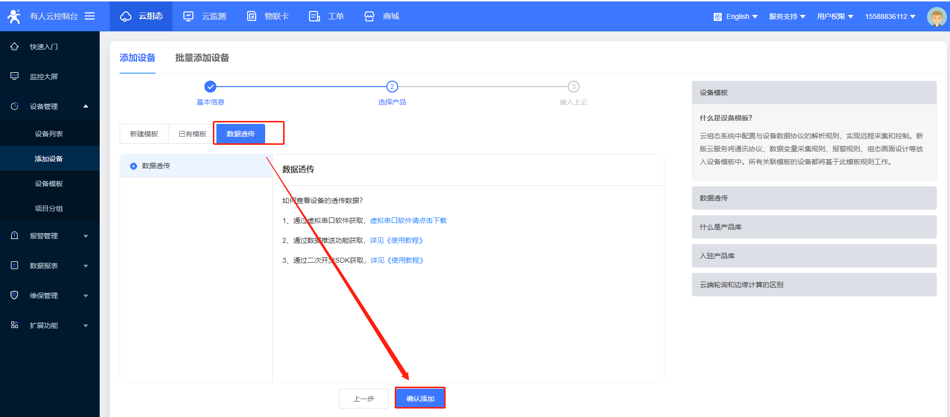 4>再添加一个设备,用于虚拟串口软件,选择数据透传,添加成功后可以在设备列表中看到