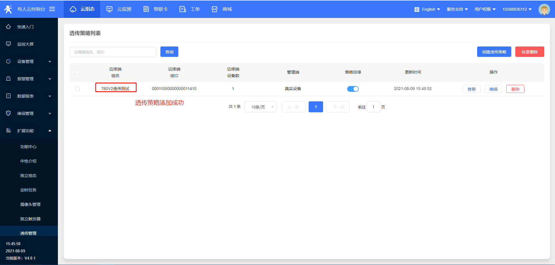 9>透传管理策略创建成功