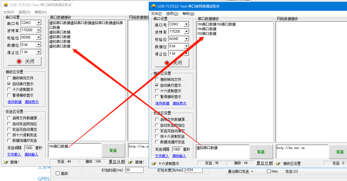 打开两个串口调试软件