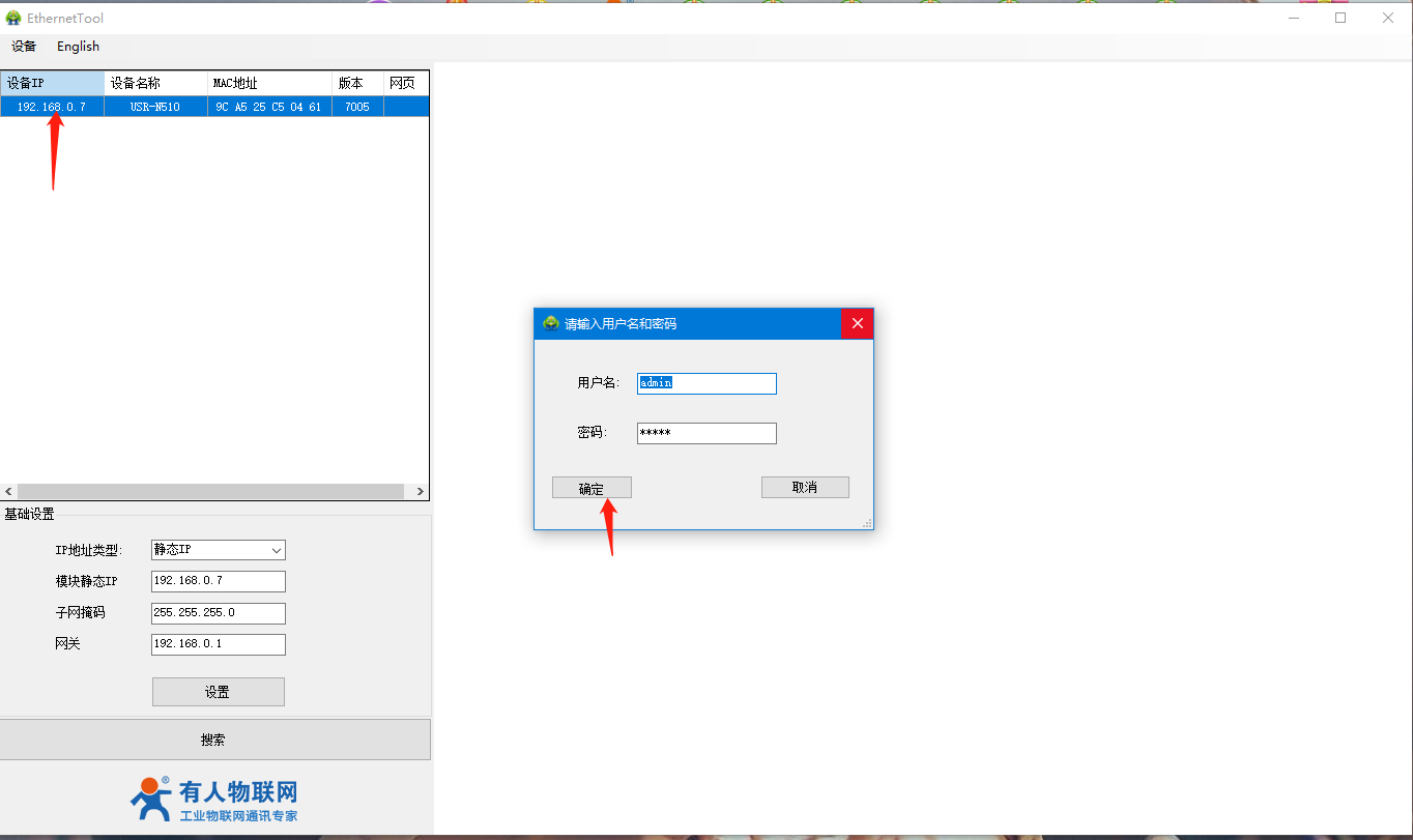 4、打开510(H7)系列设置软件,点击搜索设备,可以搜索到510,并且可以看到目前510的相关信息,IP为192.168.0.7(默认),设备名称为:USR-N510,MAC地址为:9C A5 25 XX XX XX,版本为:7005。