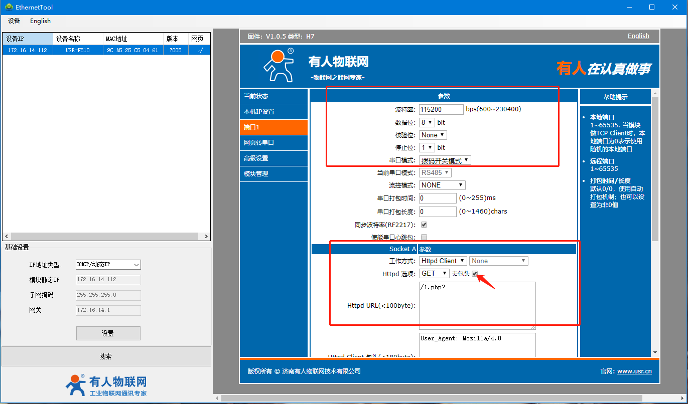 USR-N510(H7)HTTP GET模式通信案例