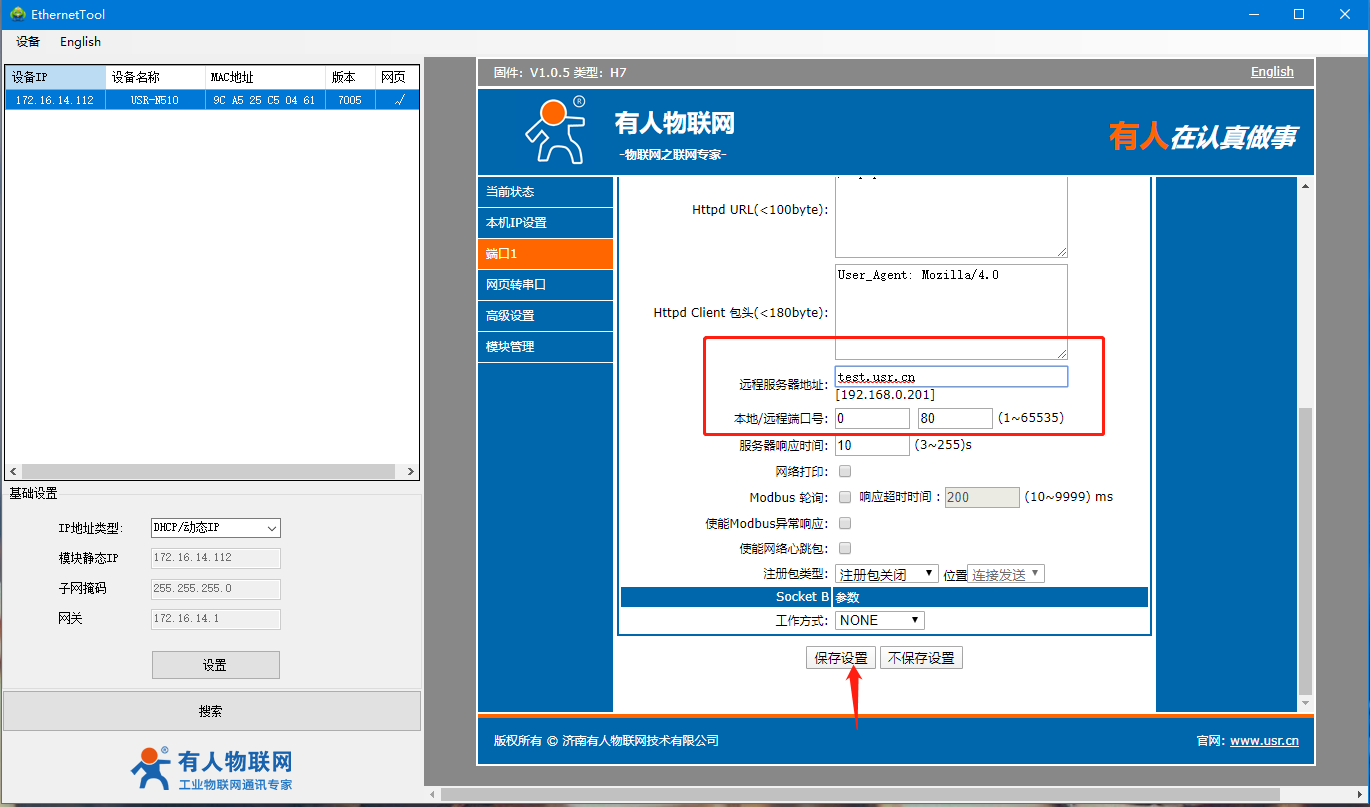 8、远程服务器地址为:test.usr.cn,远程端口为80。(这个是我司的测试服务器),参数设置无误后点击保存设置。