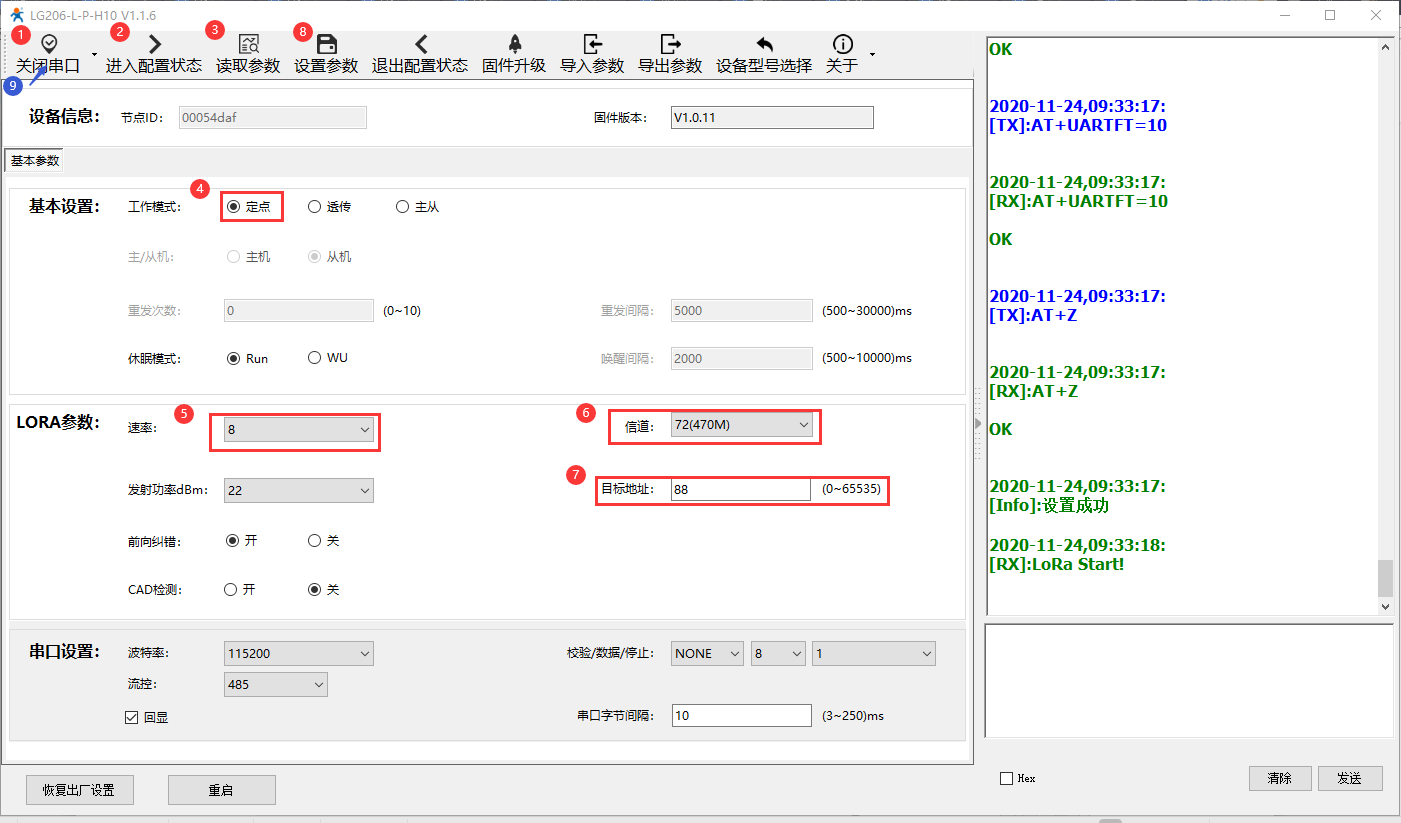 设备A:定点模式,速率8,信道72,目标地址88。