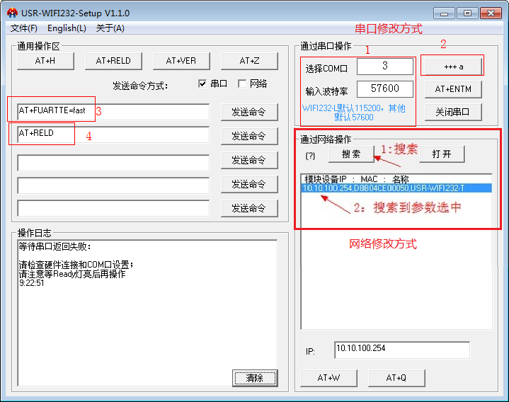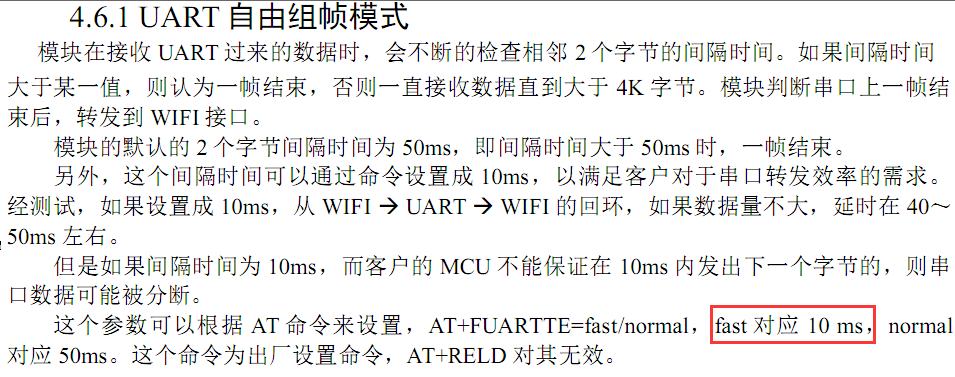 发送AT+FUARTTE=fast。 然后再发送AT+RELD使指令生效,注:改指令需要恢复出厂设置才能生效,设置完成支持请重新设置WiFi模块的参数。