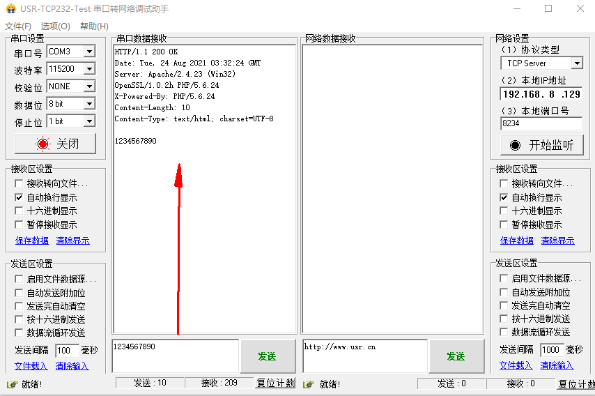 打开串口网络助手,串口参数和N510 端口1参数保持一致,串口发送数据1234567890,测试服务器返回数据。