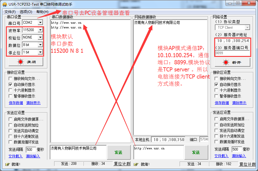 以WiFi232-T为例,模块串口连接电脑串口,电脑连接WiFi。