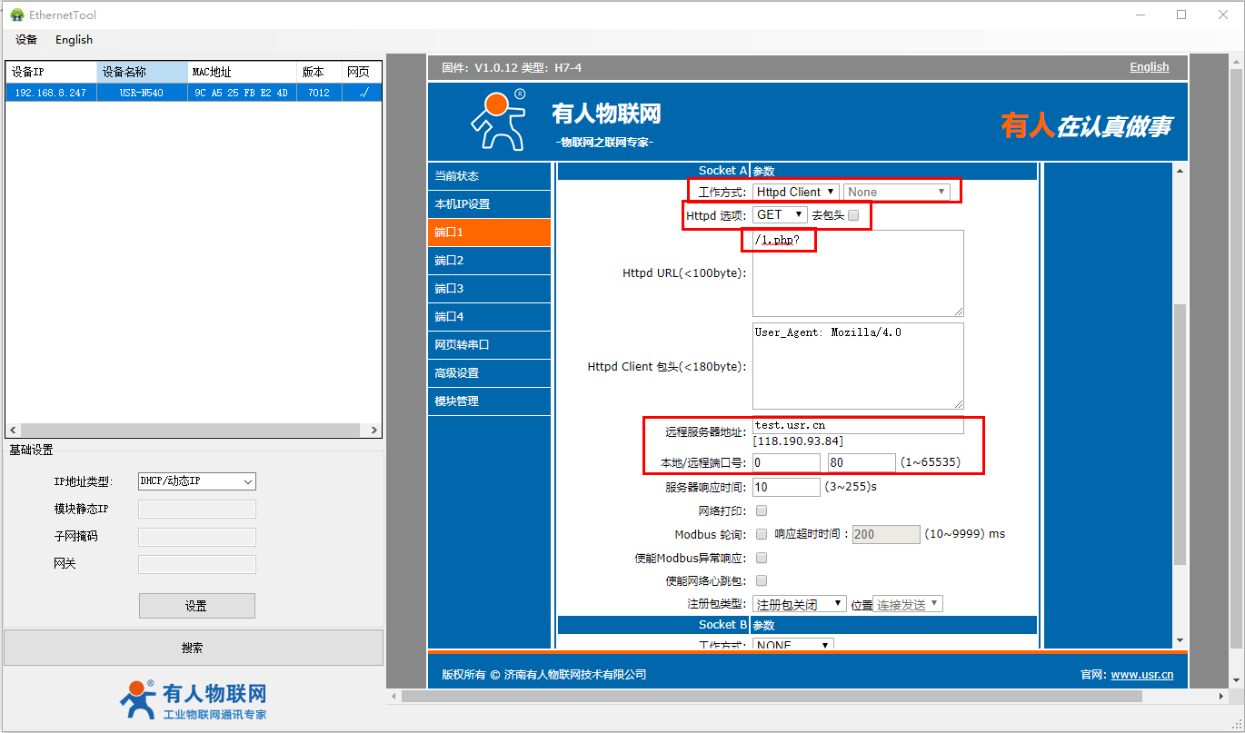 N540端口1工作方式设置HTTPD模式,GET,远程服务器地址填test.usr.cn,远程端口填80,本地端口号设置为0。URL填/1.php?,不滤除报头。