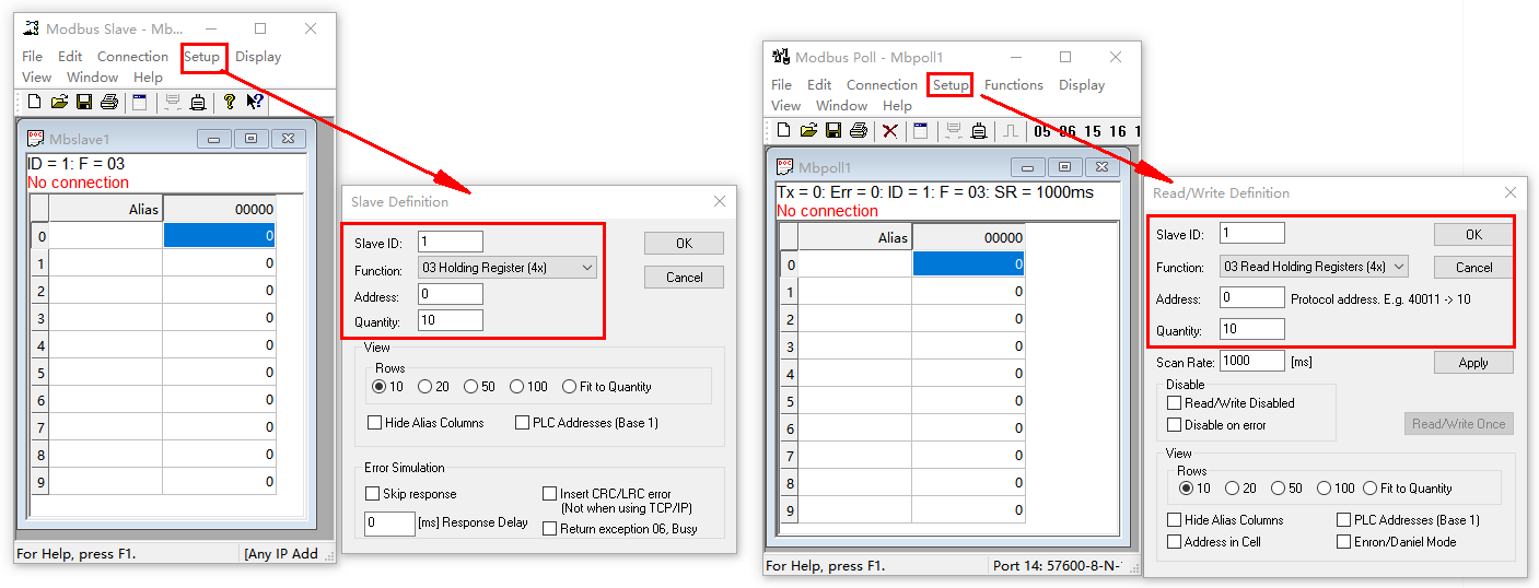 2、MODBUS SLAVE和MODBUS POLL软件设置: