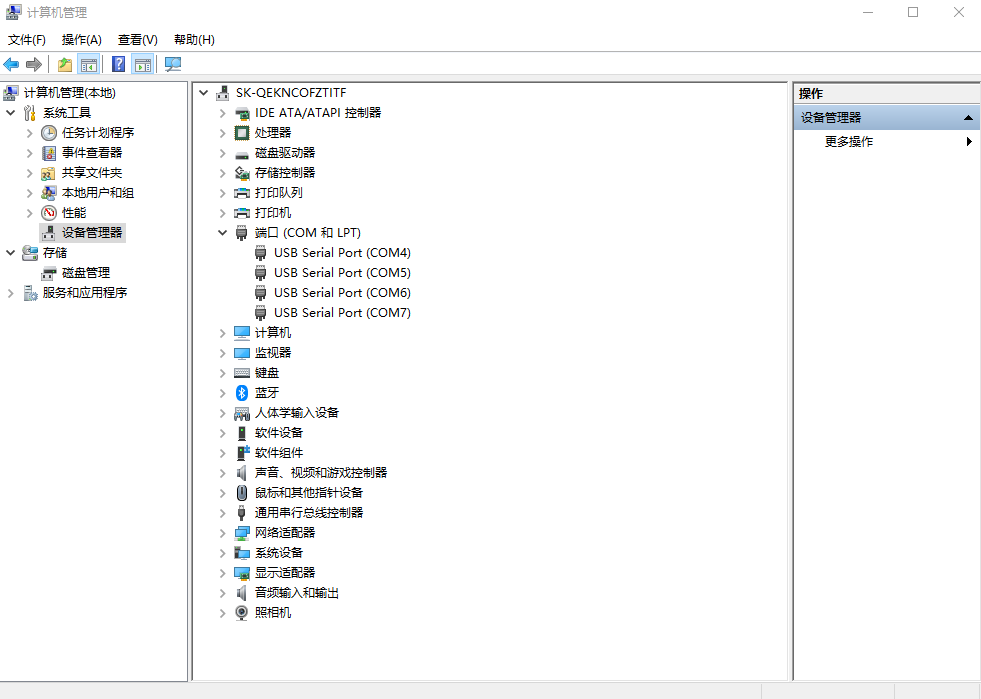 电脑鼠标点击计算器管理,右击,点开设备管理器,点击端口,查看USB-RS232串口线的COM口号。