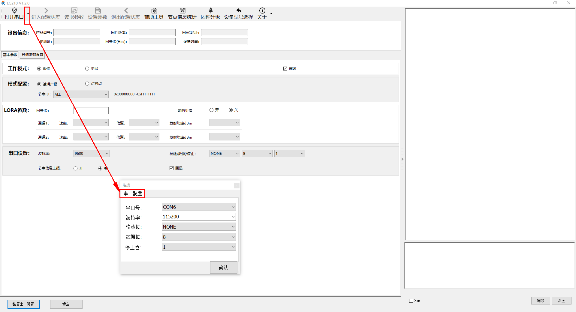 设置串口配置,选择USB-RS232串口线的COM口号,USR-LG210默认串口参数是115200,NONE,8,1。