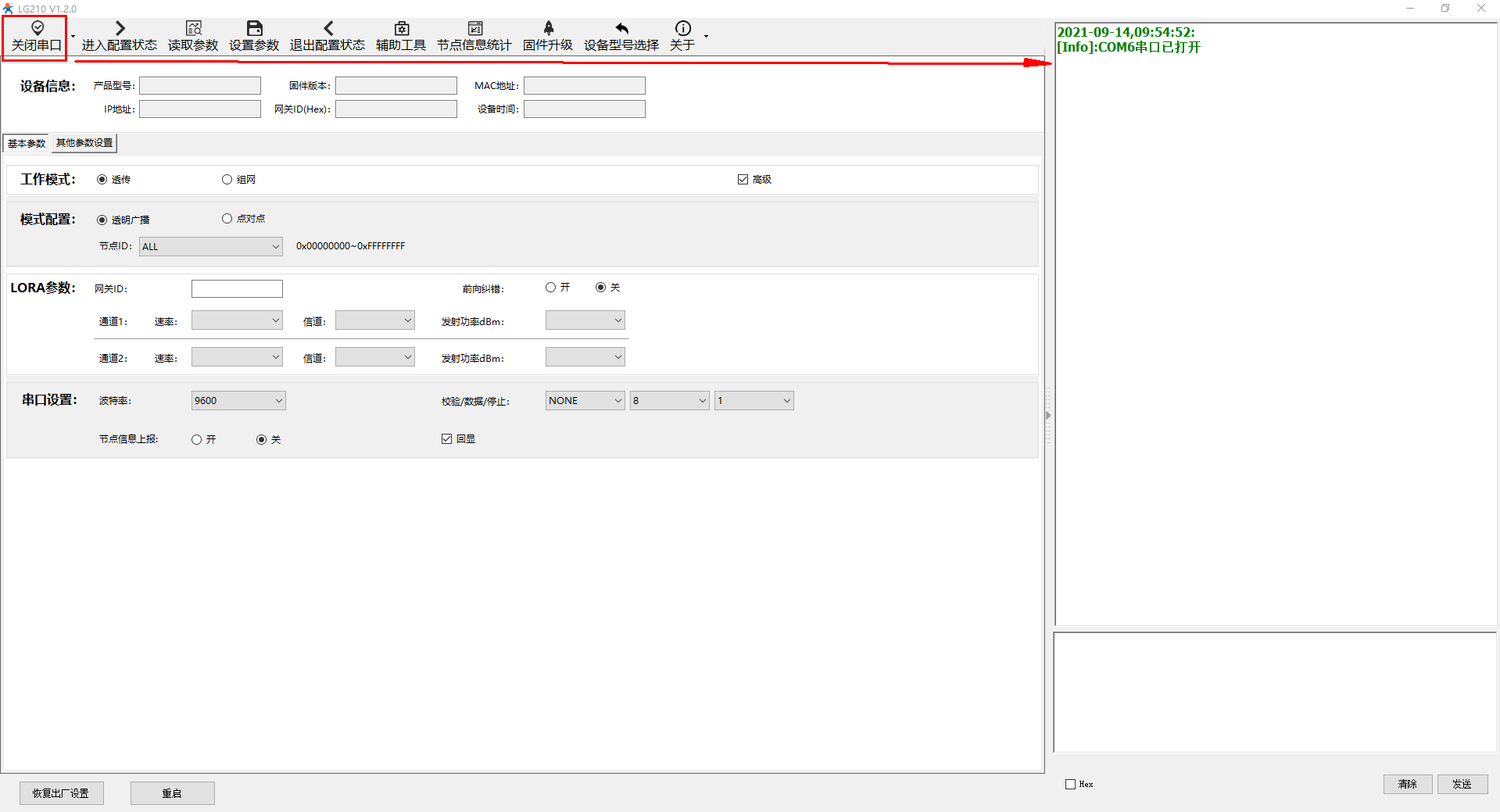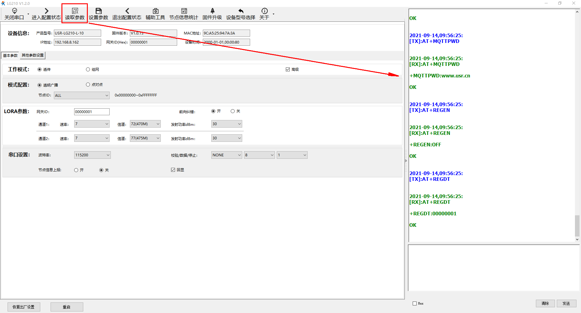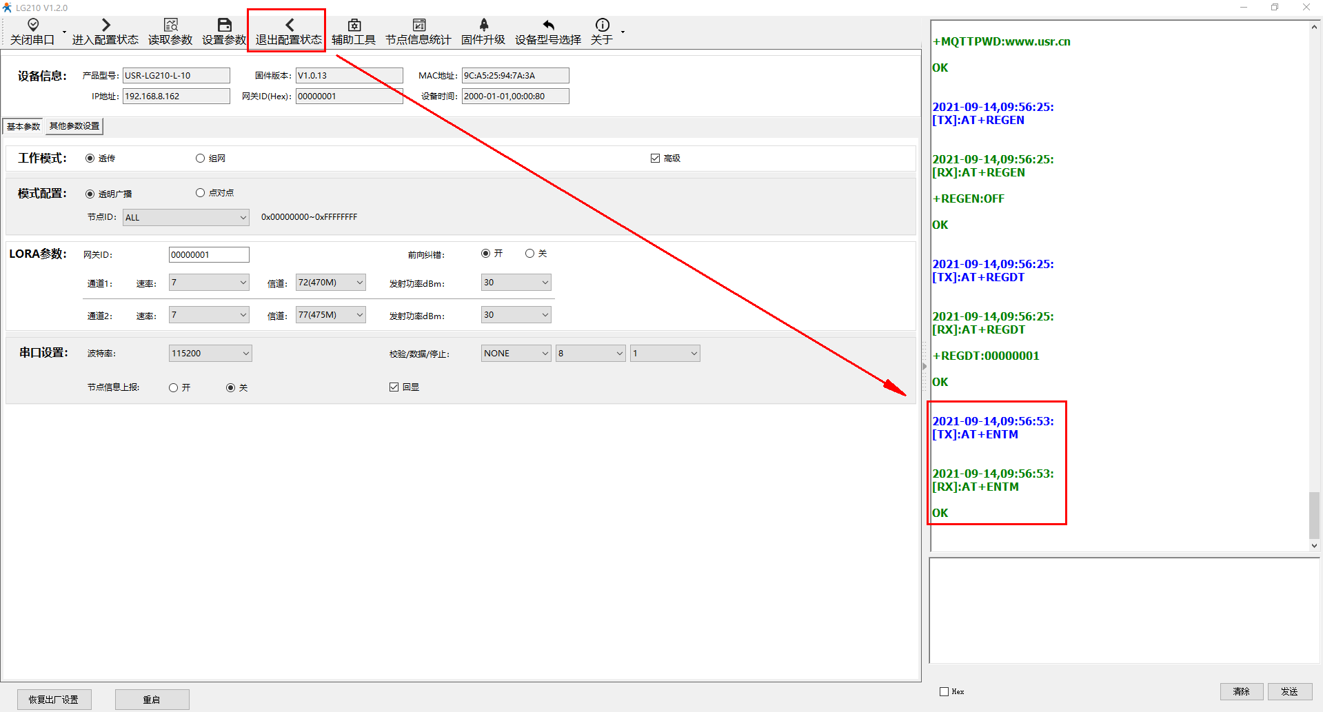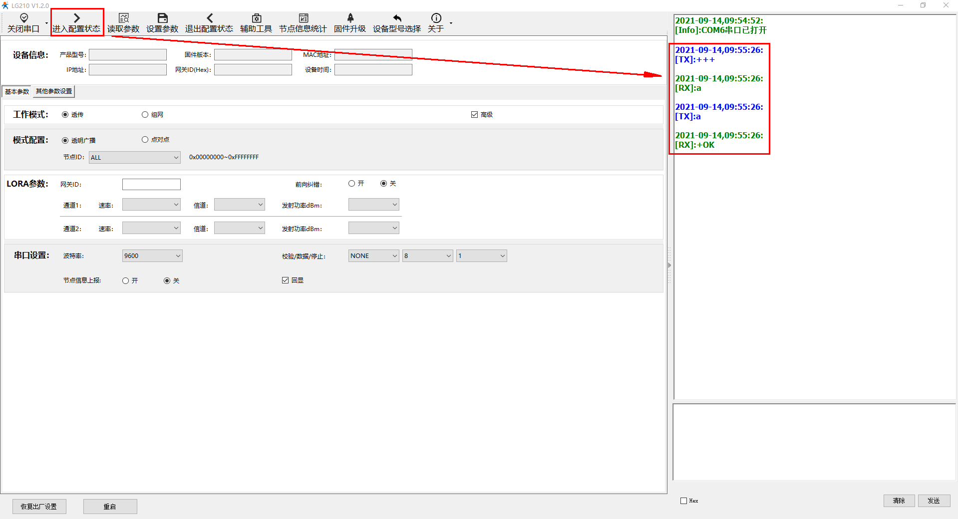 打开串口,点击进入配置状态,返回+++a,a+Ok,接着读取参数,可以正常读取参数后,点击退出配置状态。