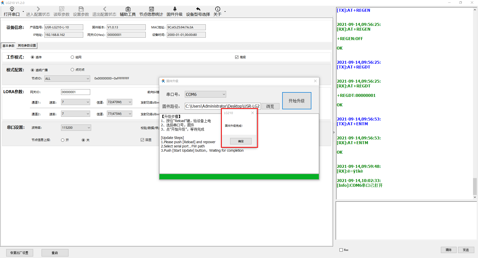 验证USB-RS232串口线通讯正常,接着就可以对USR-LG210-L进行固件升级。