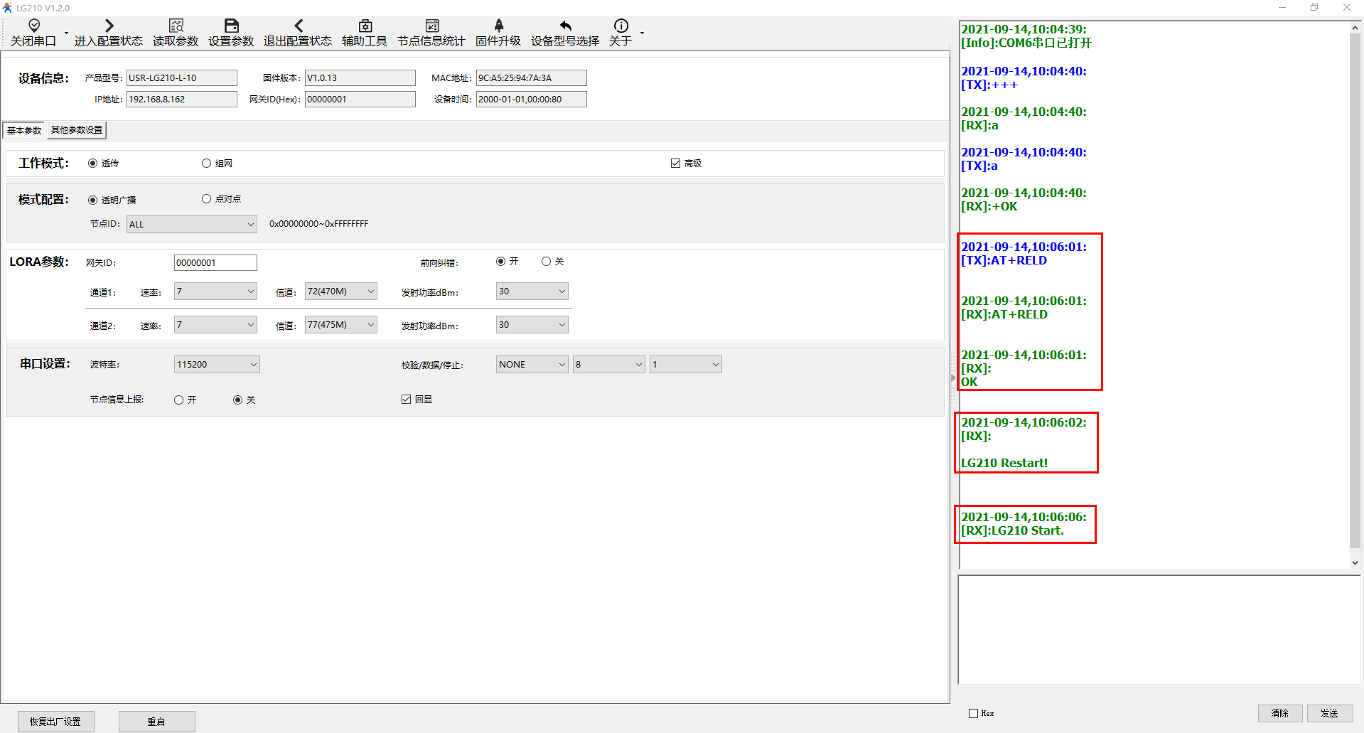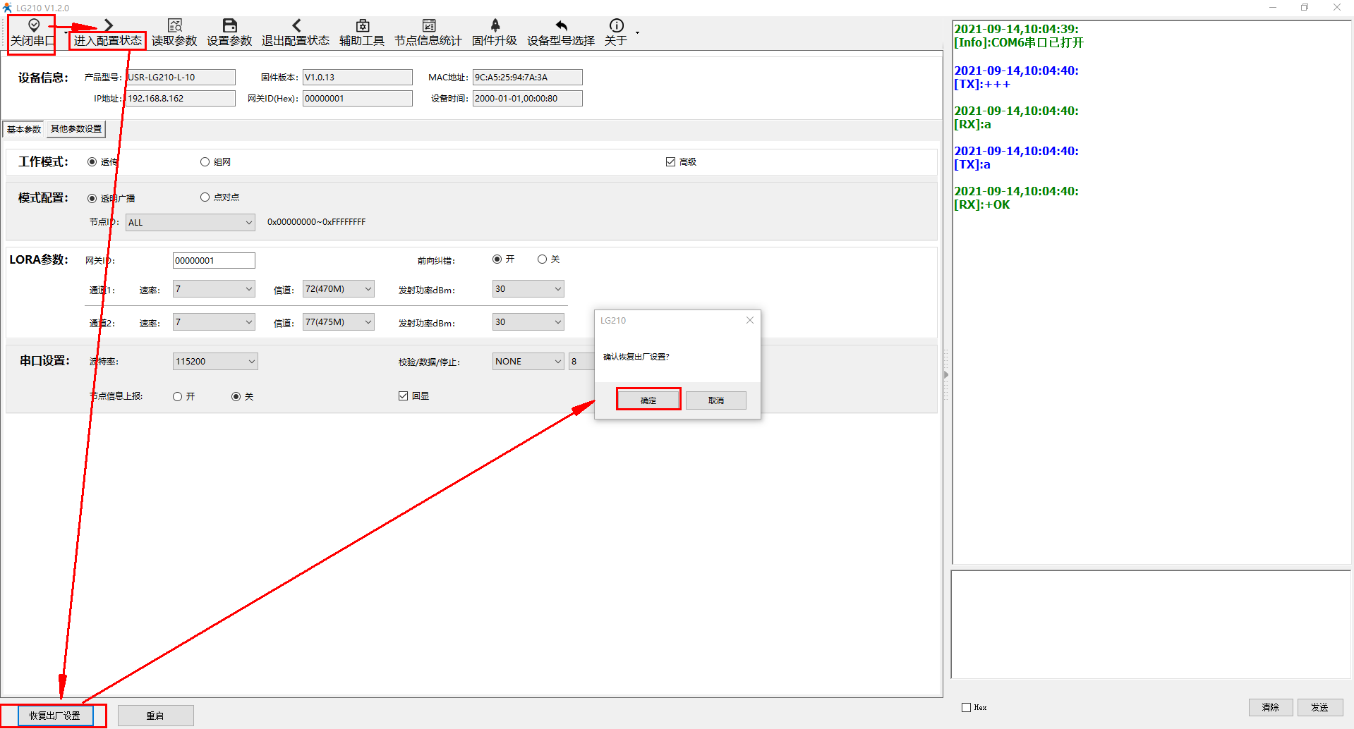 升级完成,USR-LG210-L使用设置软件,打开串口,点击进入配置状态,点击恢复出厂值。进行恢复出厂值设置,恢复出厂值成功后,可以对USR-LG210-L进行参数设置。