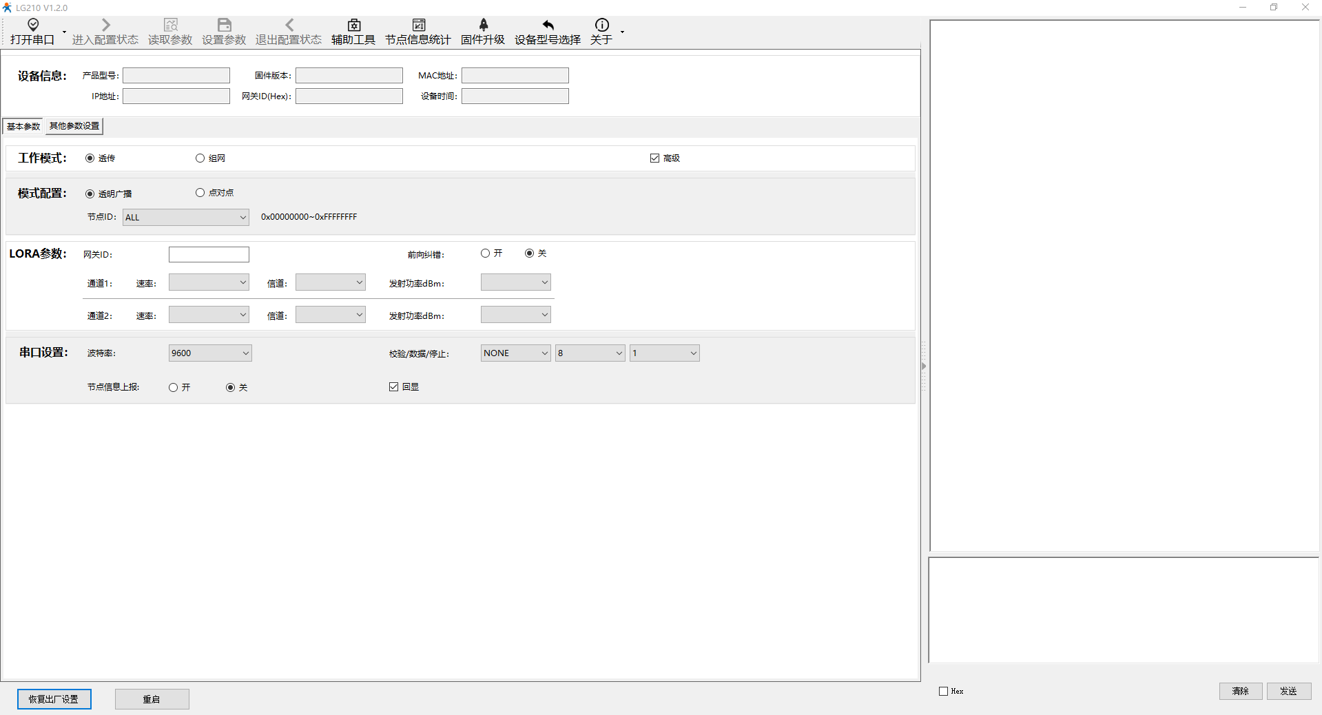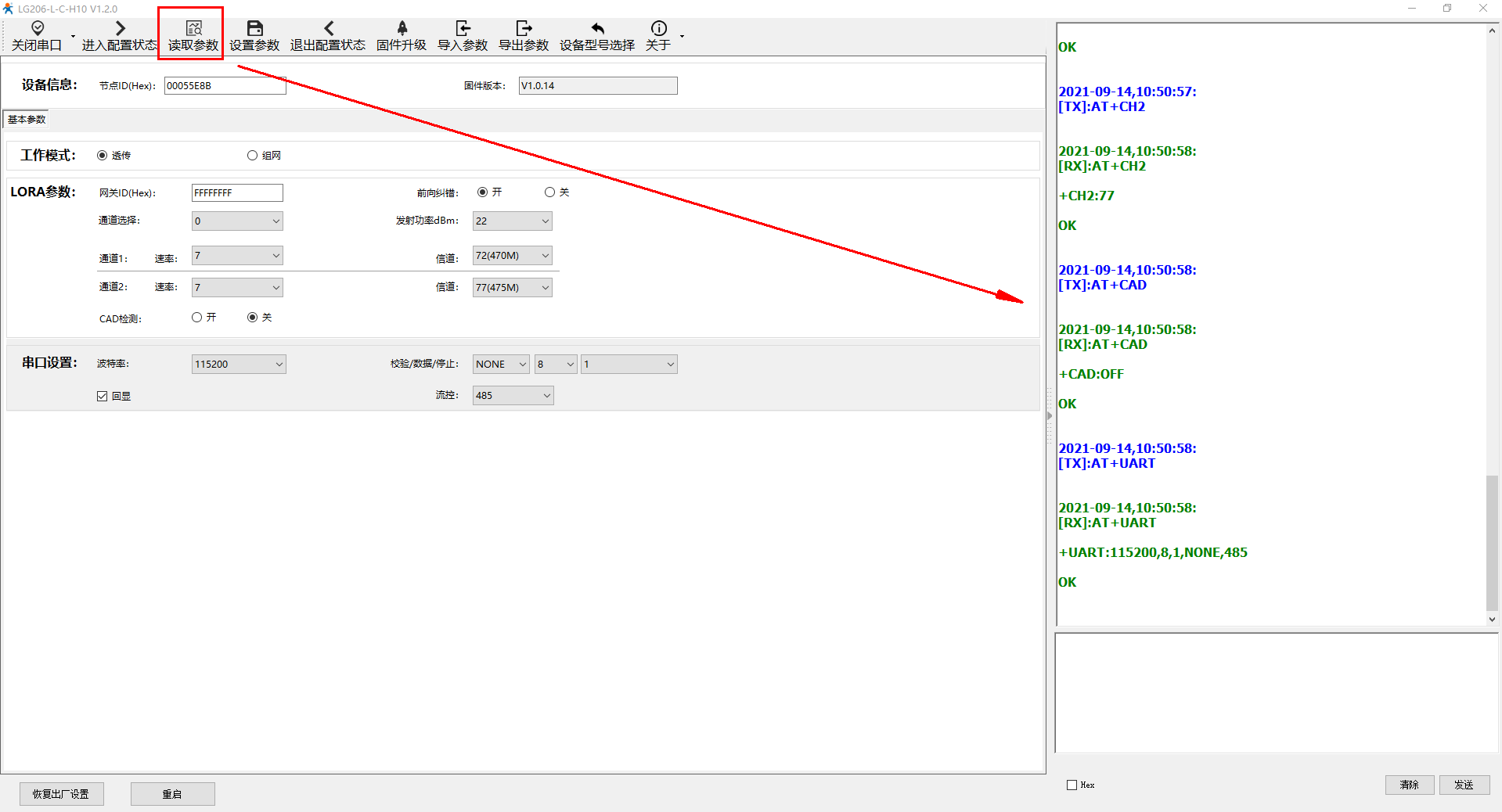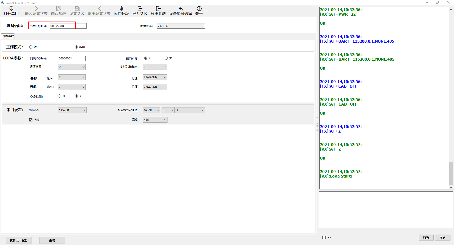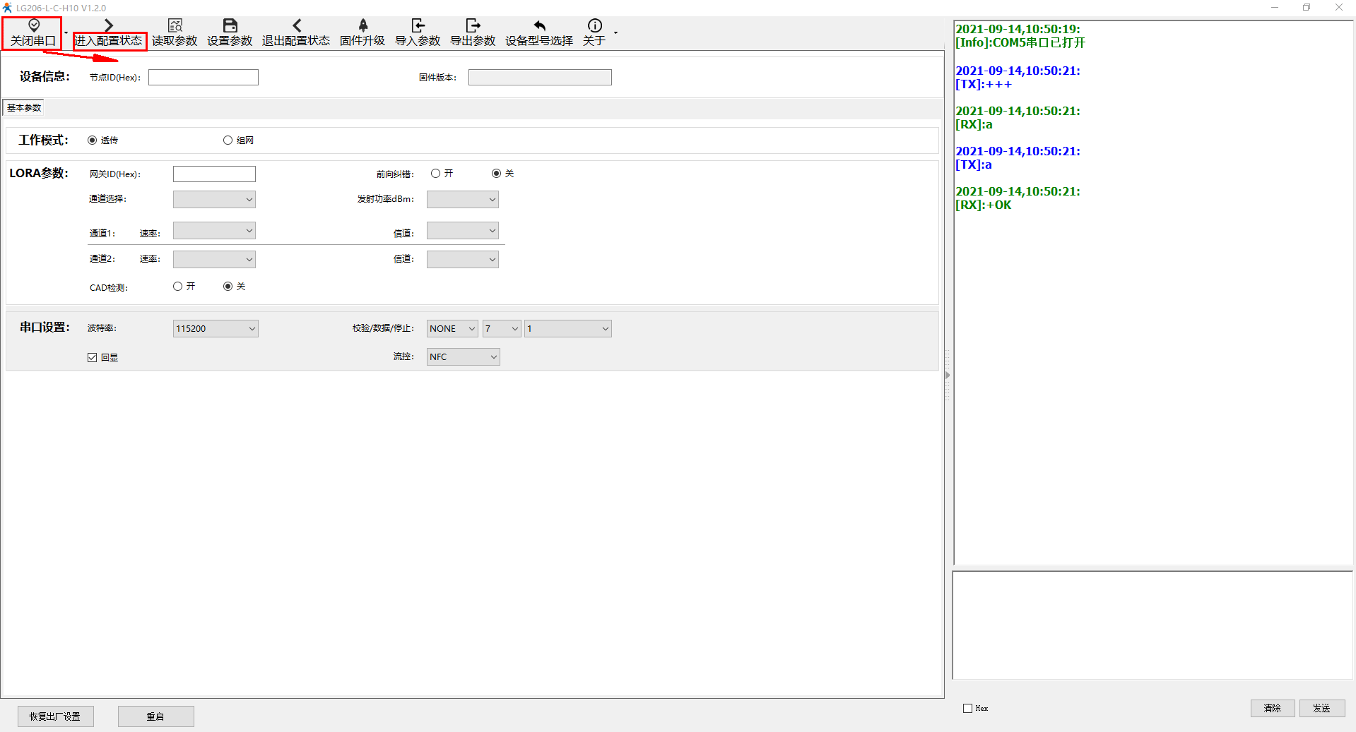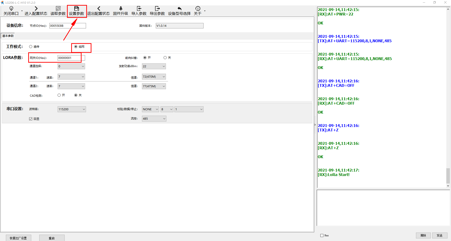 电脑打开USR-LG206-L-C-H10的设置软件,打开串口,点击进入配置状态,读取参数,然后设置组网模式,通道一和通道二的速率、信道设置和USR-LG210-L的通道一和通道二的速率、信道一致。网关ID设置为00000001,和USR-LG210-L的网关ID一致。