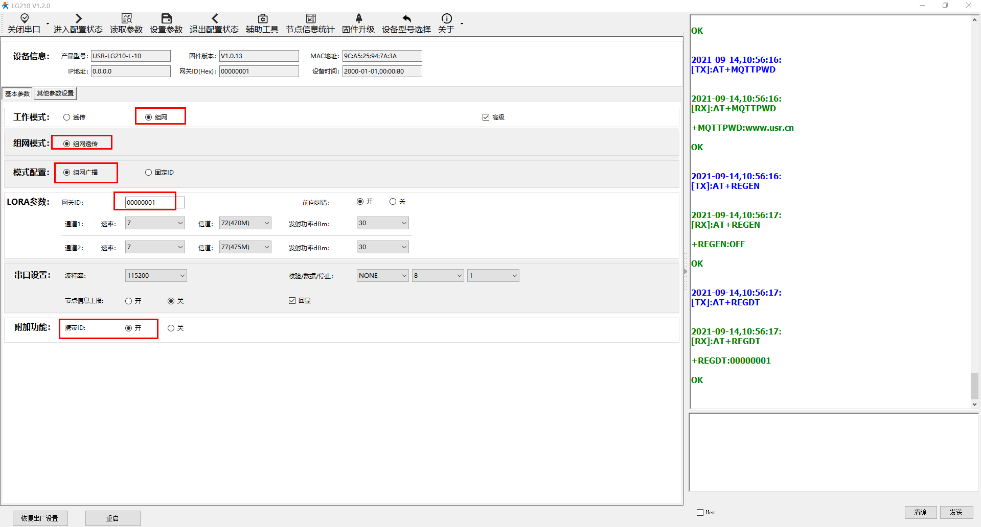 电脑打开USR-LG210-L的设置软件,打开串口,点击进入配置状态,读取参数,然后设置组网模式,网关ID设置为00000001,开启携带ID功能,其他参数设置选择串口。设置参数保存重启。