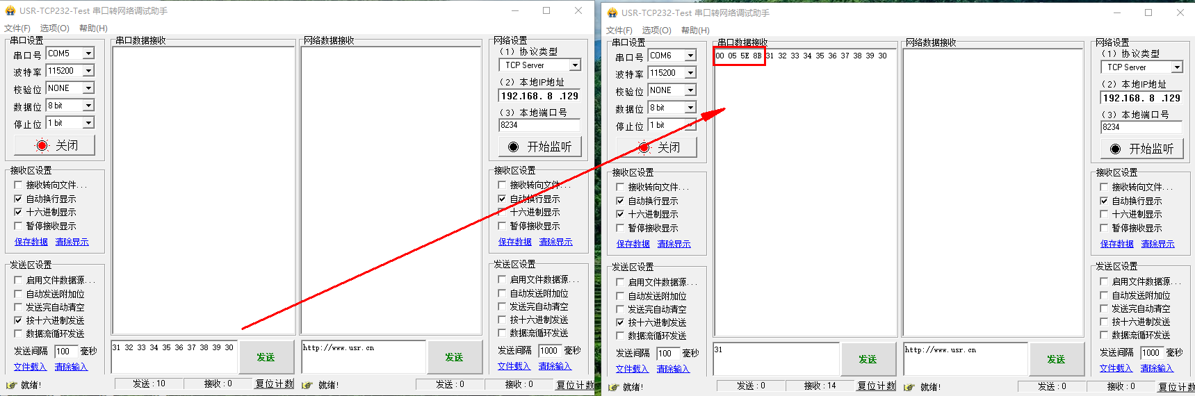 打开2个串口网络助手,分别选择USR-LG206-L-C-H10和USR-LG210的USB-RS232串口线COM口号,打开串口,然后USR-LG206-L-C-H10发送数据,USR-LG210-L的串口软件接收数据。