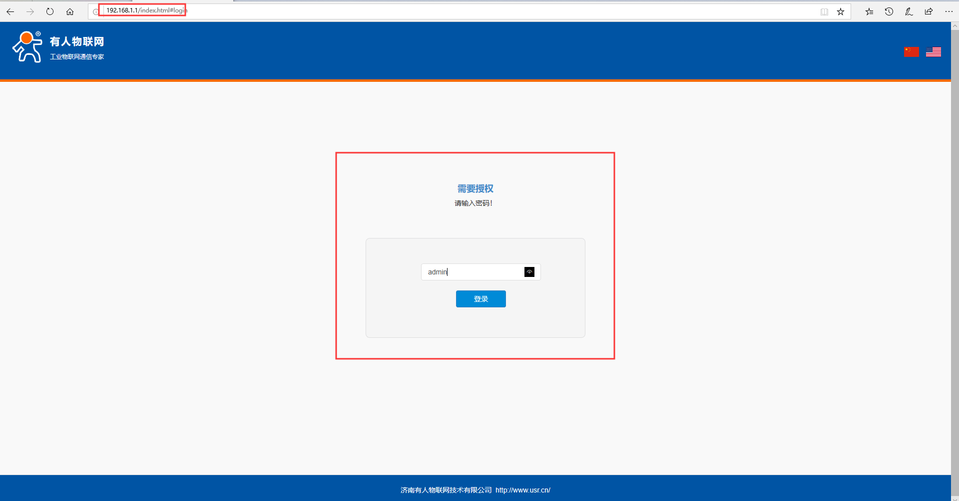 4.打开浏览器(不要用360浏览器),在地址栏输入电脑获取到的网关,通过网关登录内置网页界面,出厂默认网关为192.168.1.1、密码为admin
