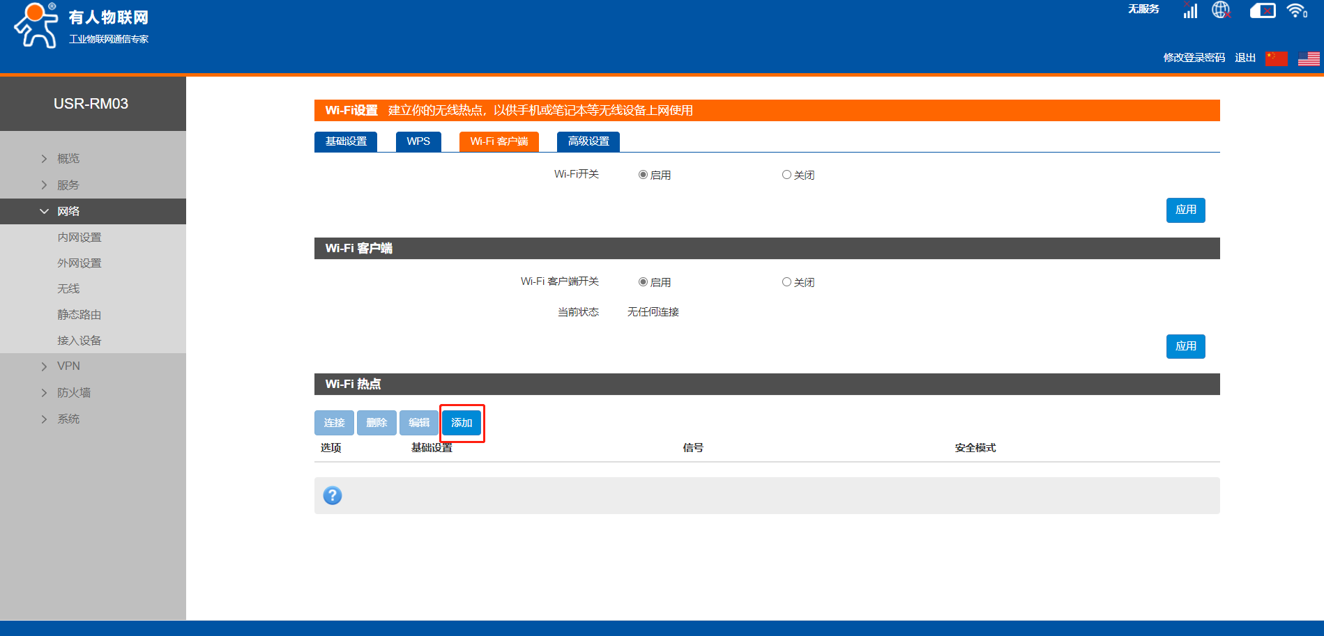 5. 内置网页 网络-无线界面,启用wifi客户端之后点击应用