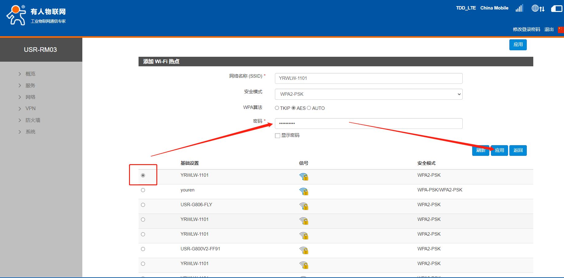 7. 选中想要连接的 AP 名称,填入密码。点击应用进行添加