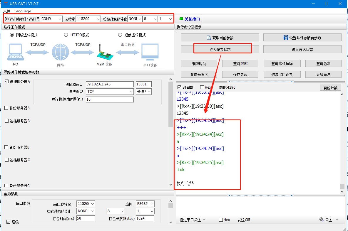(4)打开串口后,先点击进入配置状态,如果模块能返回+ok的字符,说明电脑和模块连接是没有问题的;然后点击进入通讯状态,做数据通讯测试。