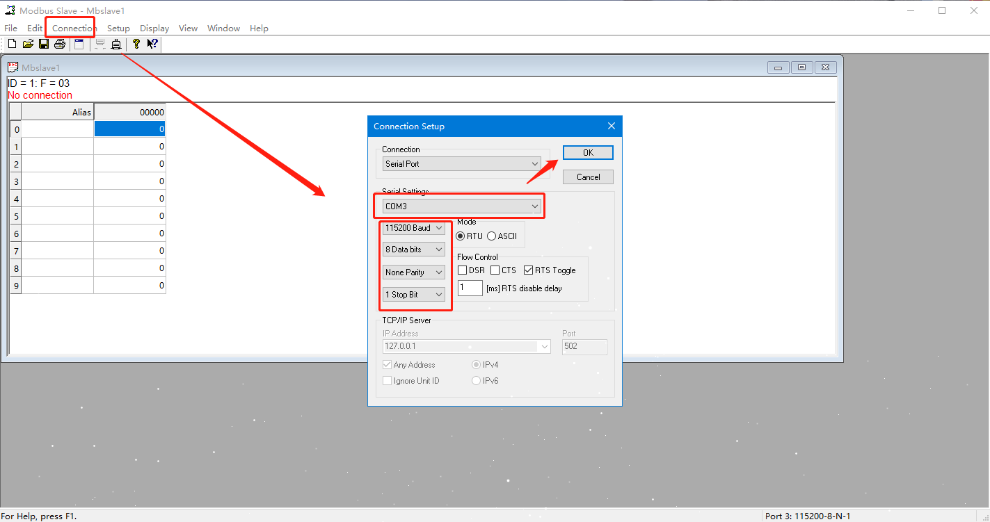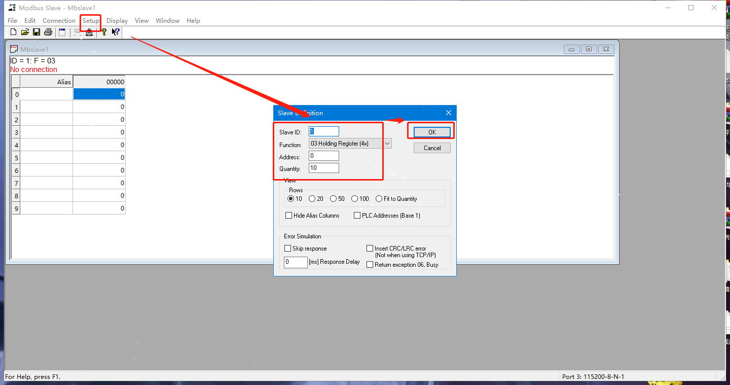 2. 打开MODBUS SLAVE软件模拟从机,以相同的串口参数打开N580的串口。