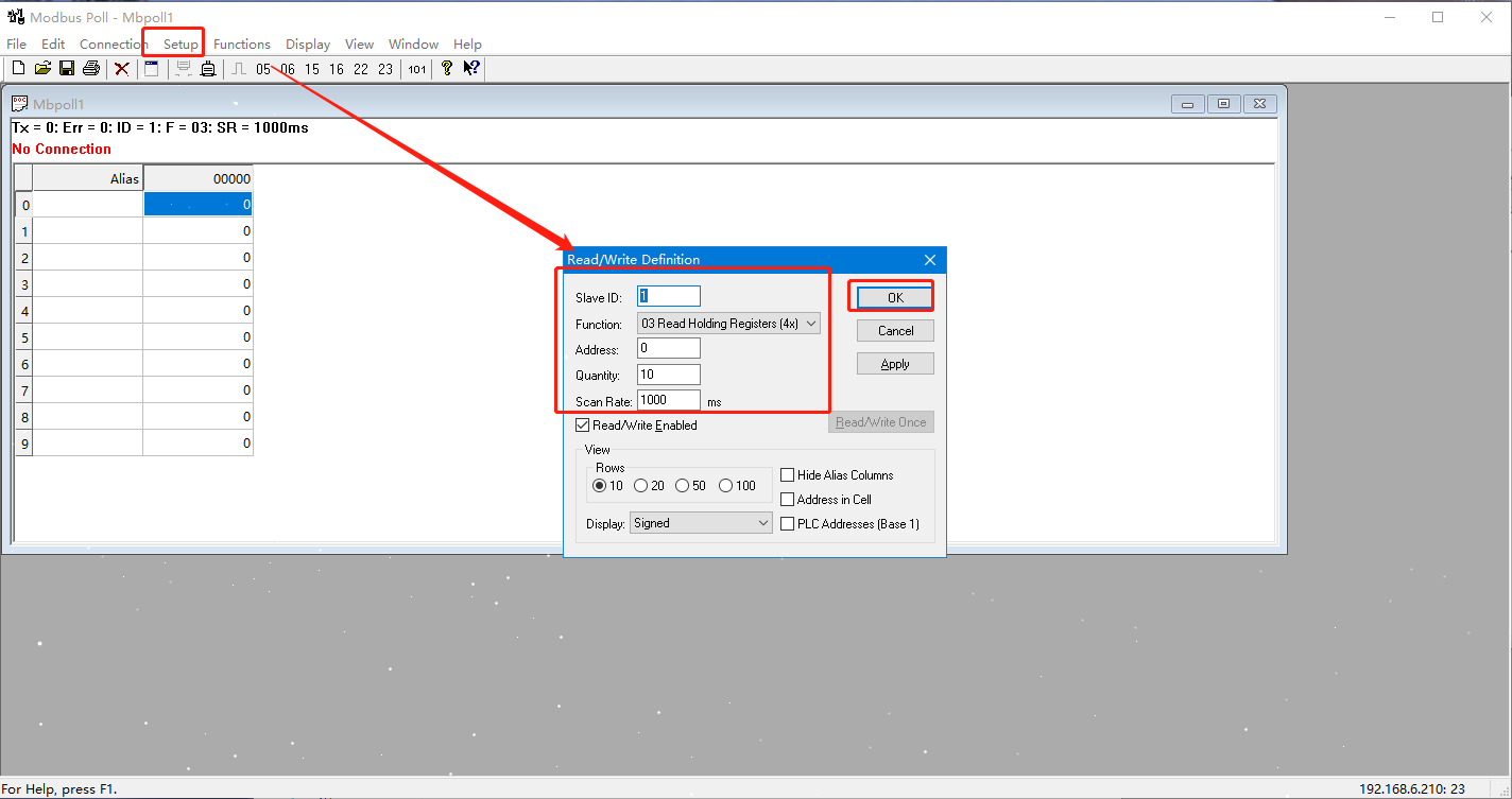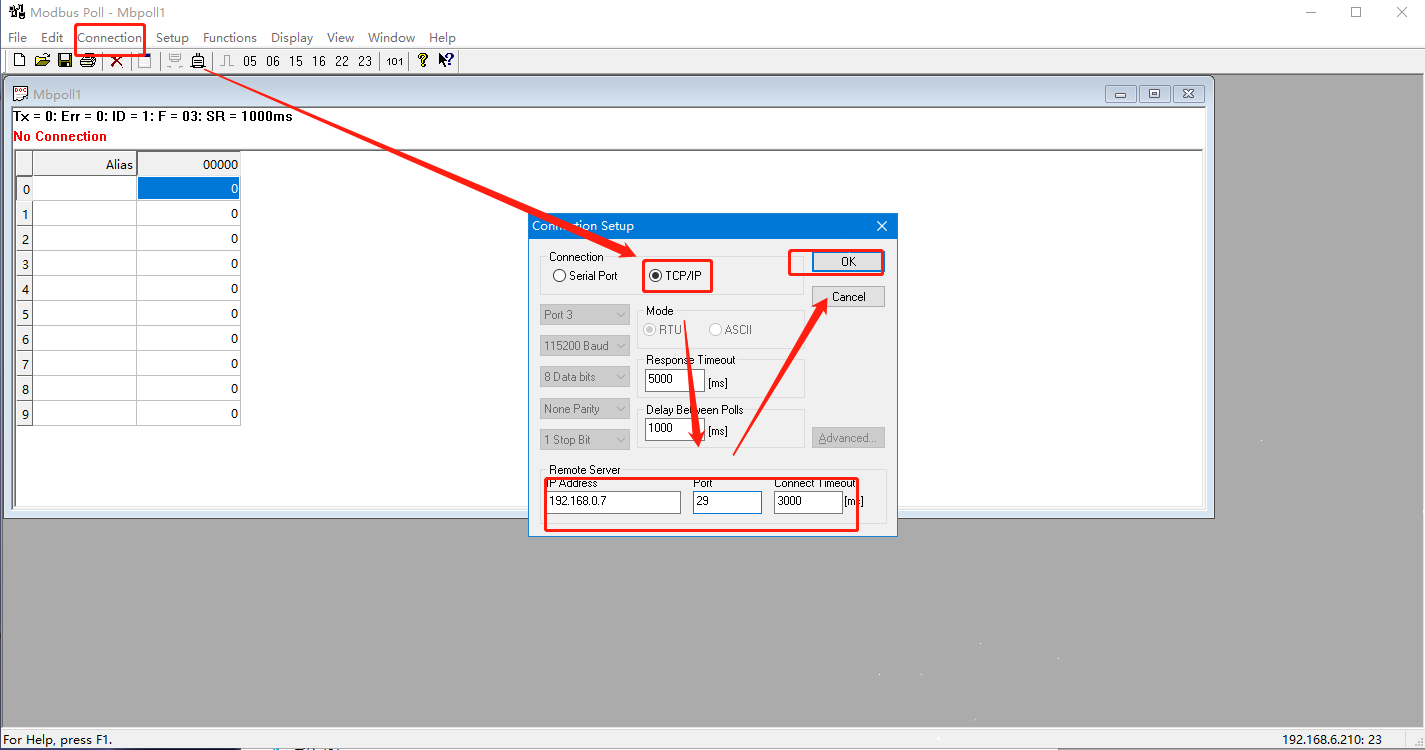 3. 打开MODBUS POLL软件模拟主机 连接N580的IP和端口 ,与其建立TCP连接。