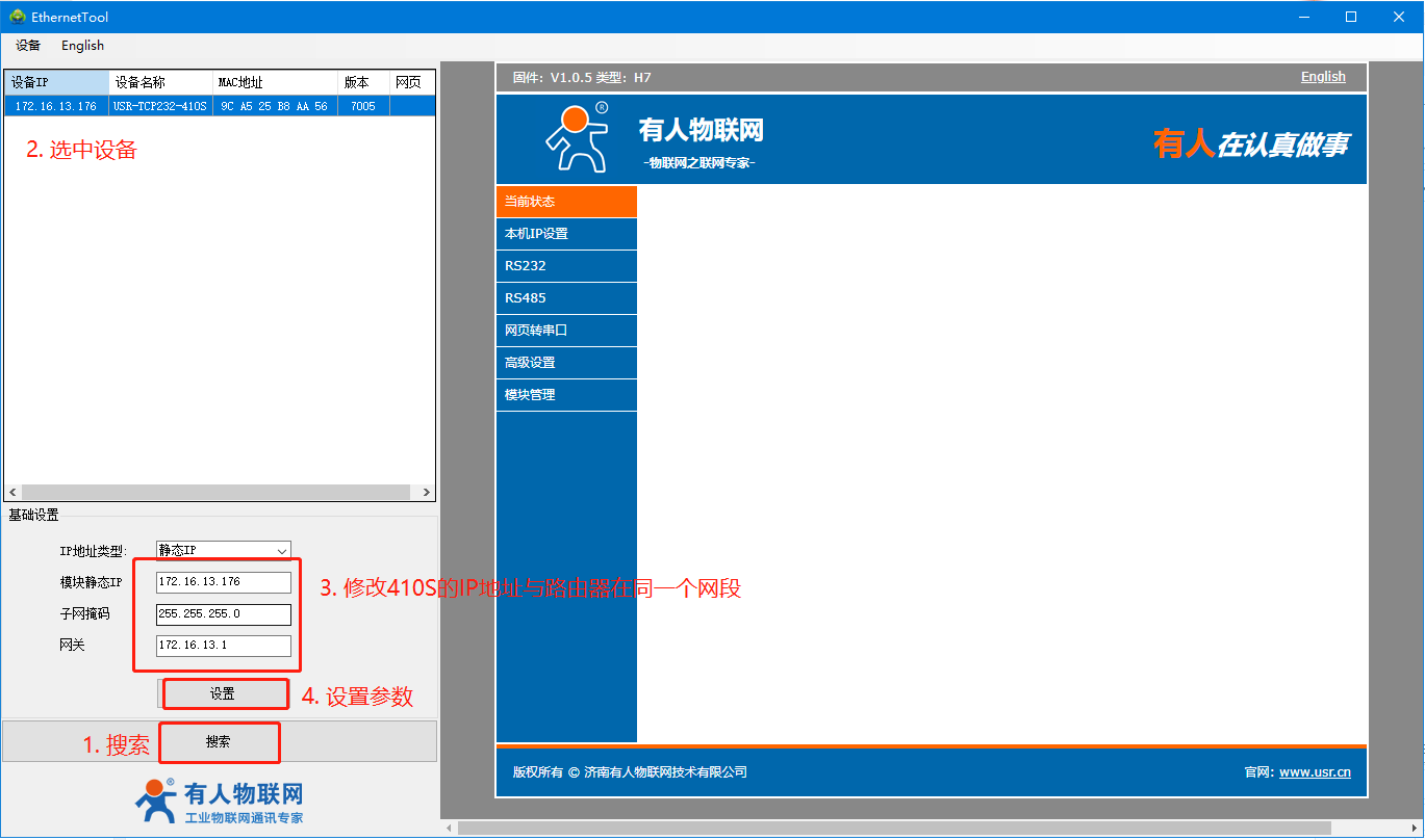 410S设置软件下载:https://www.usr.cn/Download/383.html
